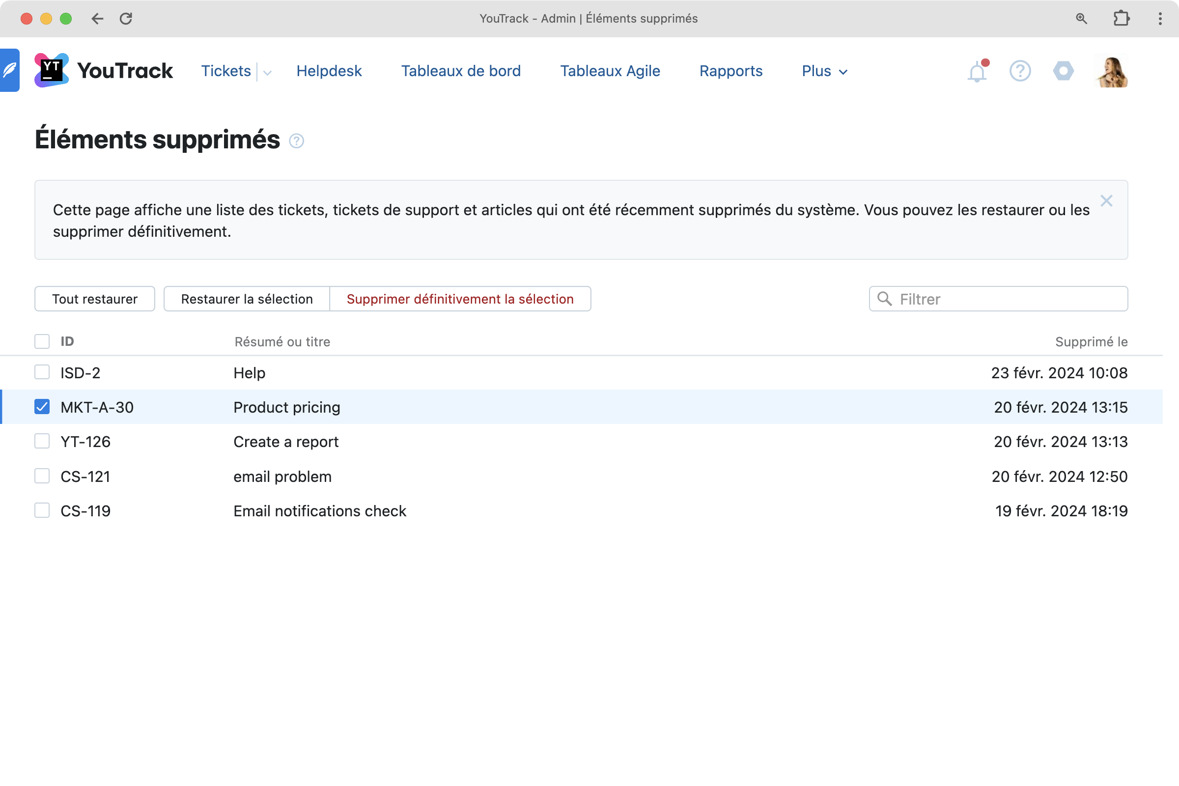 Il peut arriver que des tickets ou des articles importants soient supprimés par erreur. Vos administrateurs peuvent désormais les récupérer facilement jusqu'à deux semaines après leur suppression. De plus, les éléments ayant été supprimés volontairement peuvent maintenant être supprimés définitivement pour libérer de l'espace de stockage. Vous pouvez également suivre les suppressions et restaurations d'éléments en consultant les notifications et le flux d'activités.