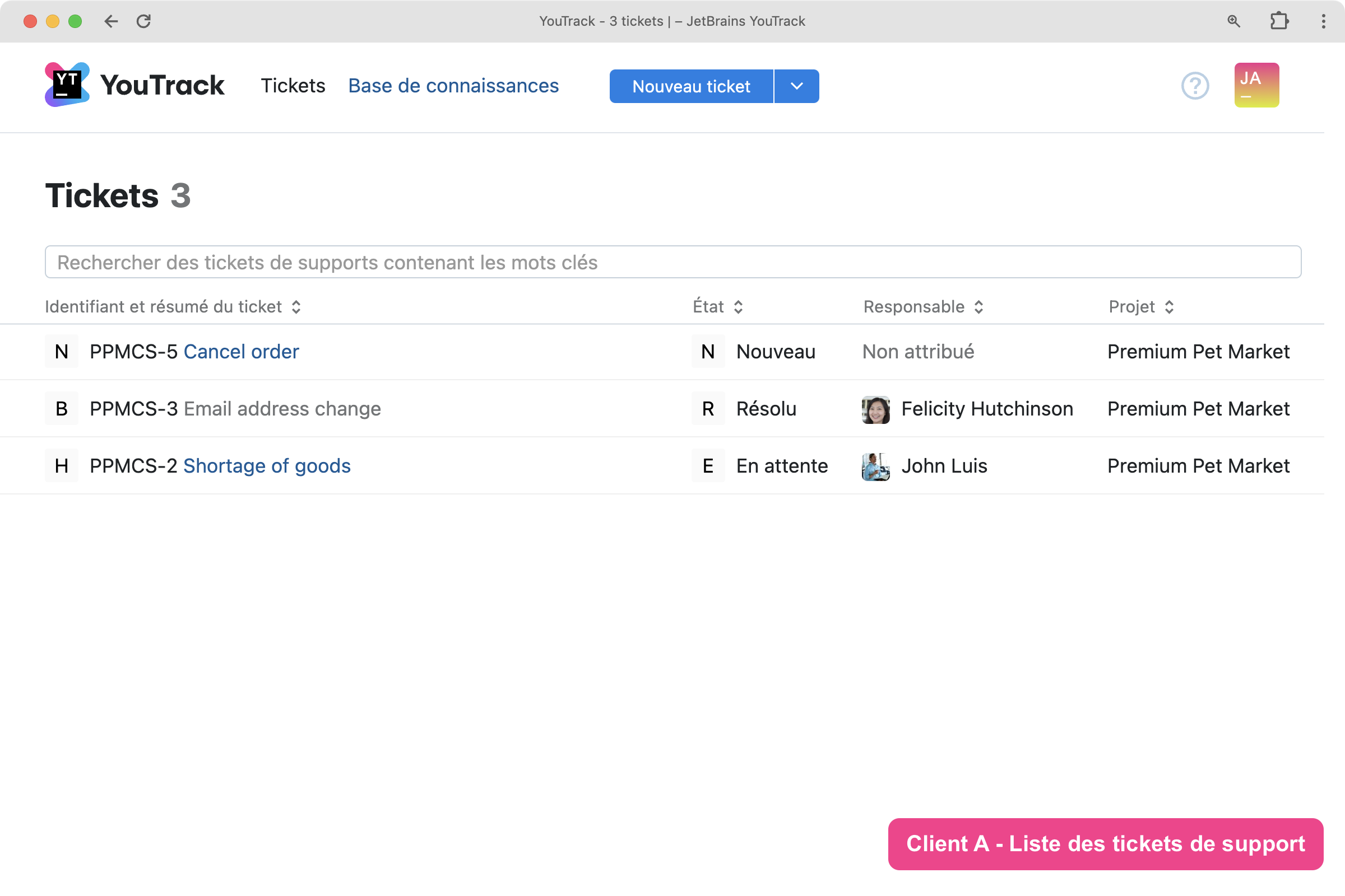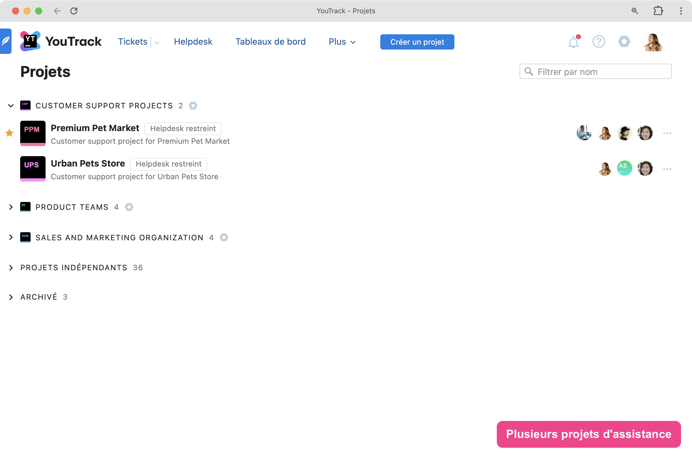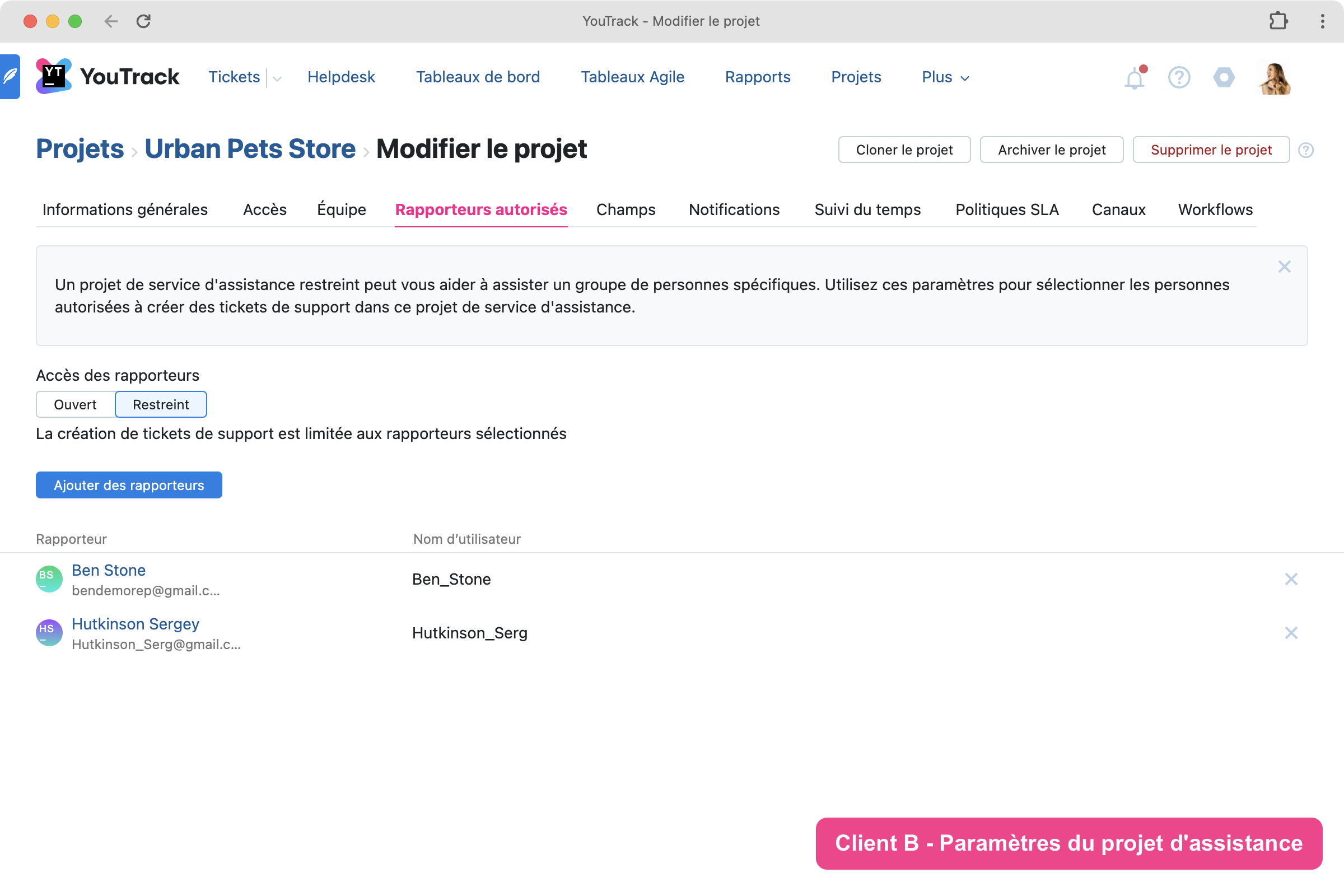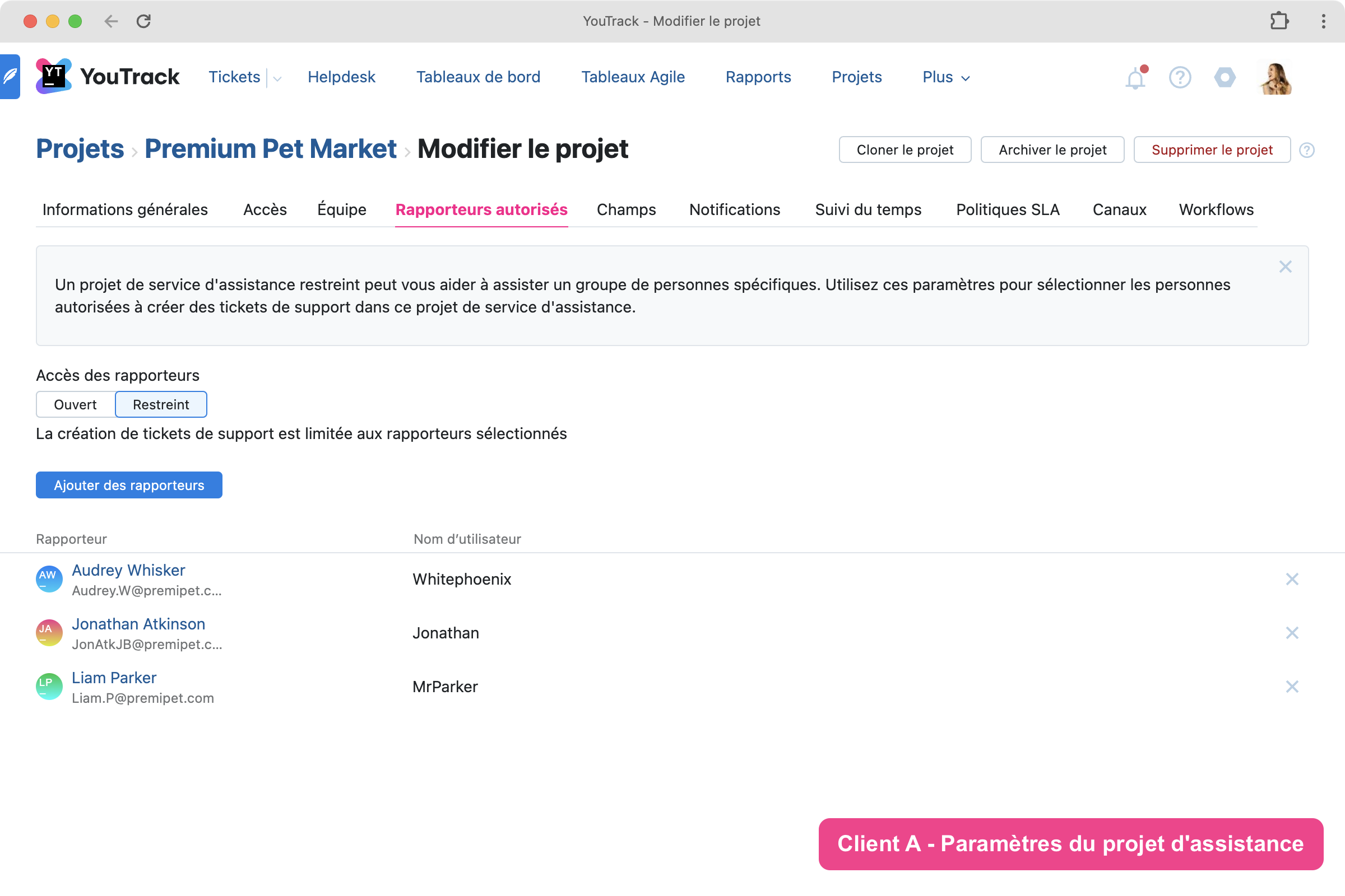 Vous pouvez maintenant restreindre l'accès à chacun de vos projets helpdesk pour qu'ils ne soient visibles que par certains rapporteurs. Les rapporteurs d'un projet donné n'auront donc pas accès aux tickets, formulaires de soumission de tickets en ligne et articles de la base de connaissances des projets helpdesk restreints à un autre groupe de rapporteurs. Cette fonctionnalité a été introduite pour les équipes d'assistance qui utilisent la même instance YouTrack pour gérer plusieurs projets helpdesk, par exemple pour gérer plusieurs produits ou entreprises clientes.