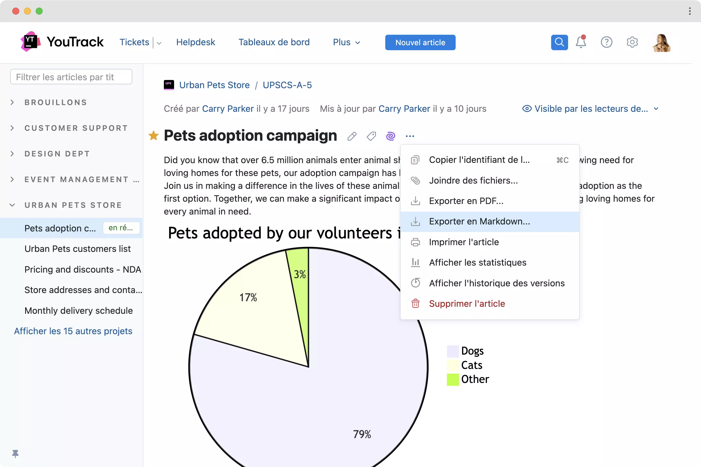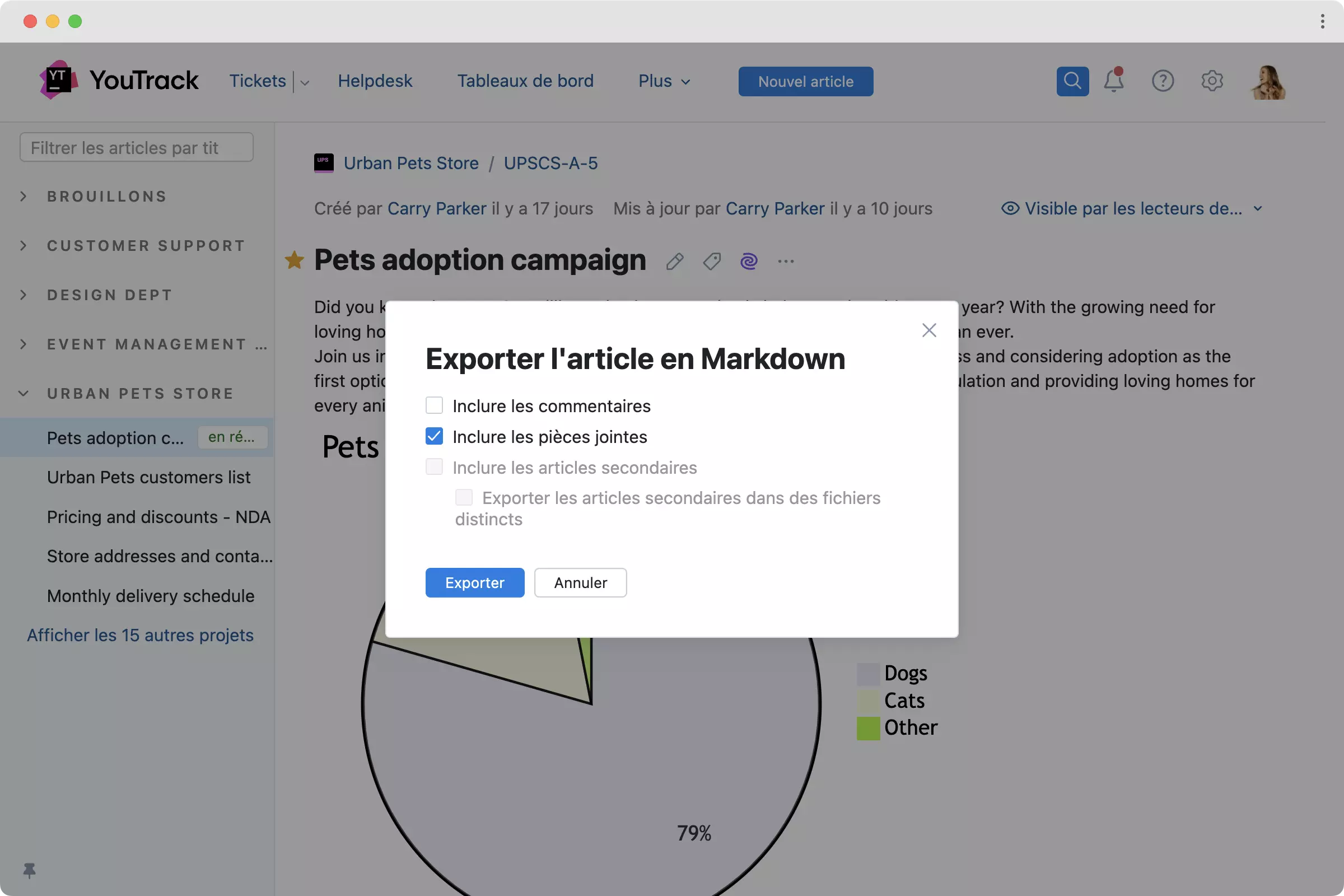 Une nouvelle option vous permet d'exporter les articles en tant que fichiers Markdown. Cela simplifie le transfert de contenu entre différentes plateformes, applications et systèmes, tout en conservant sa mise en forme ou sa structure. Vous pouvez choisir d'exporter des articles individuellement ou en incluant l'ensemble de leurs sous-articles, commentaires et pièces jointes.