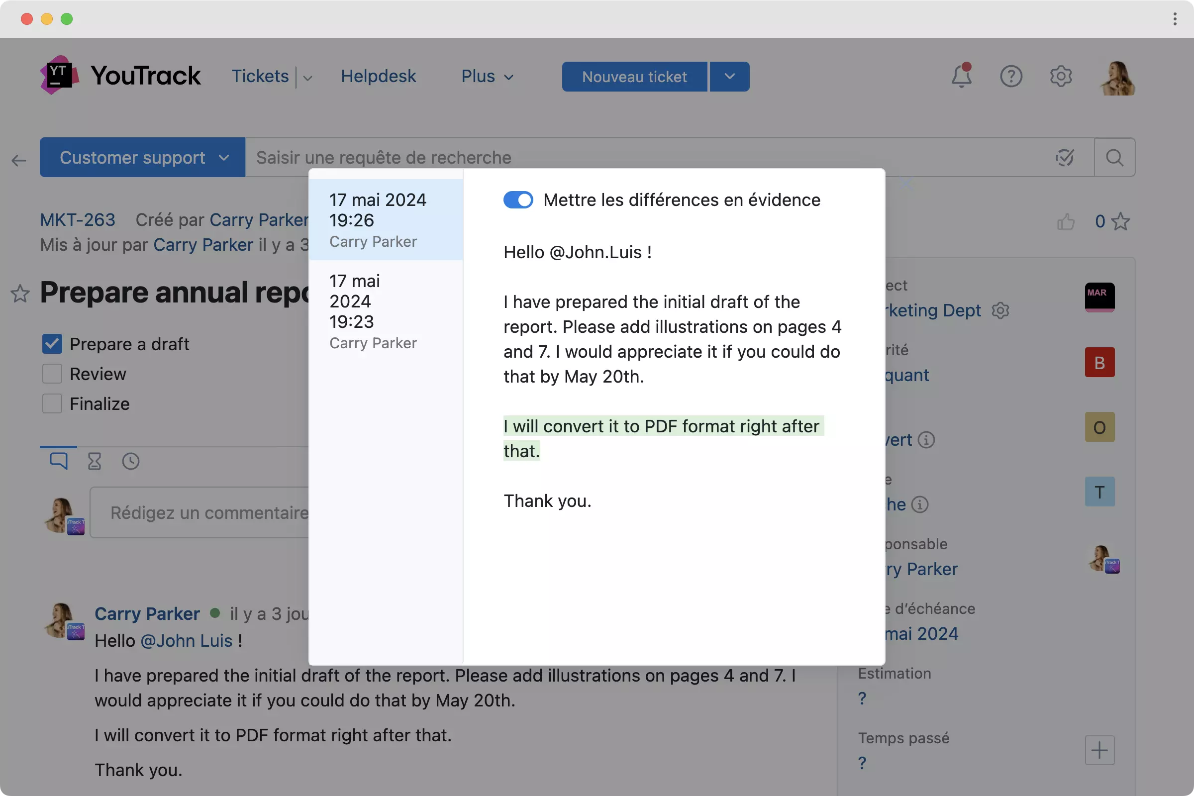 Vous pouvez désormais consulter l'historique complet des modifications apportées aux descriptions de tickets, aux articles ou aux commentaires. Cette transparence vous permet de savoir qui est à l'origine de quelle modification et à quel moment celle-ci a été effectuée. Si la modification a été faite par erreur ou doit être annulée, vous pouvez restaurer la version précédente à tout moment.