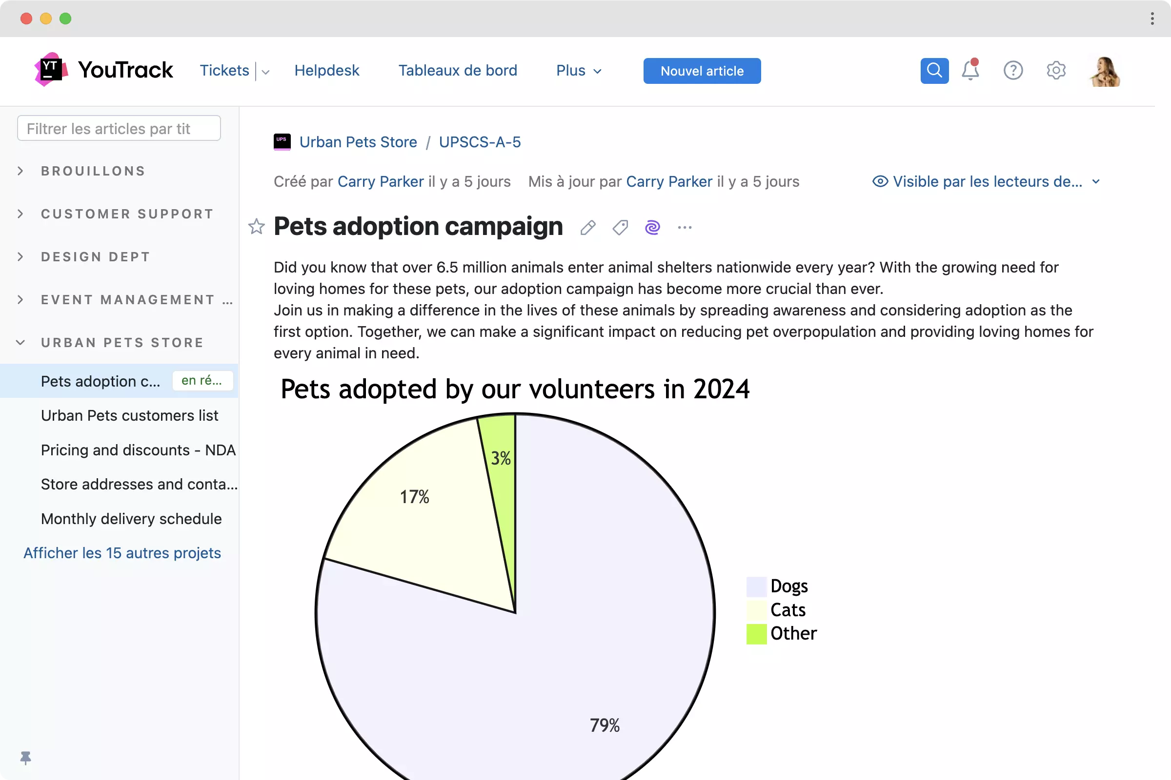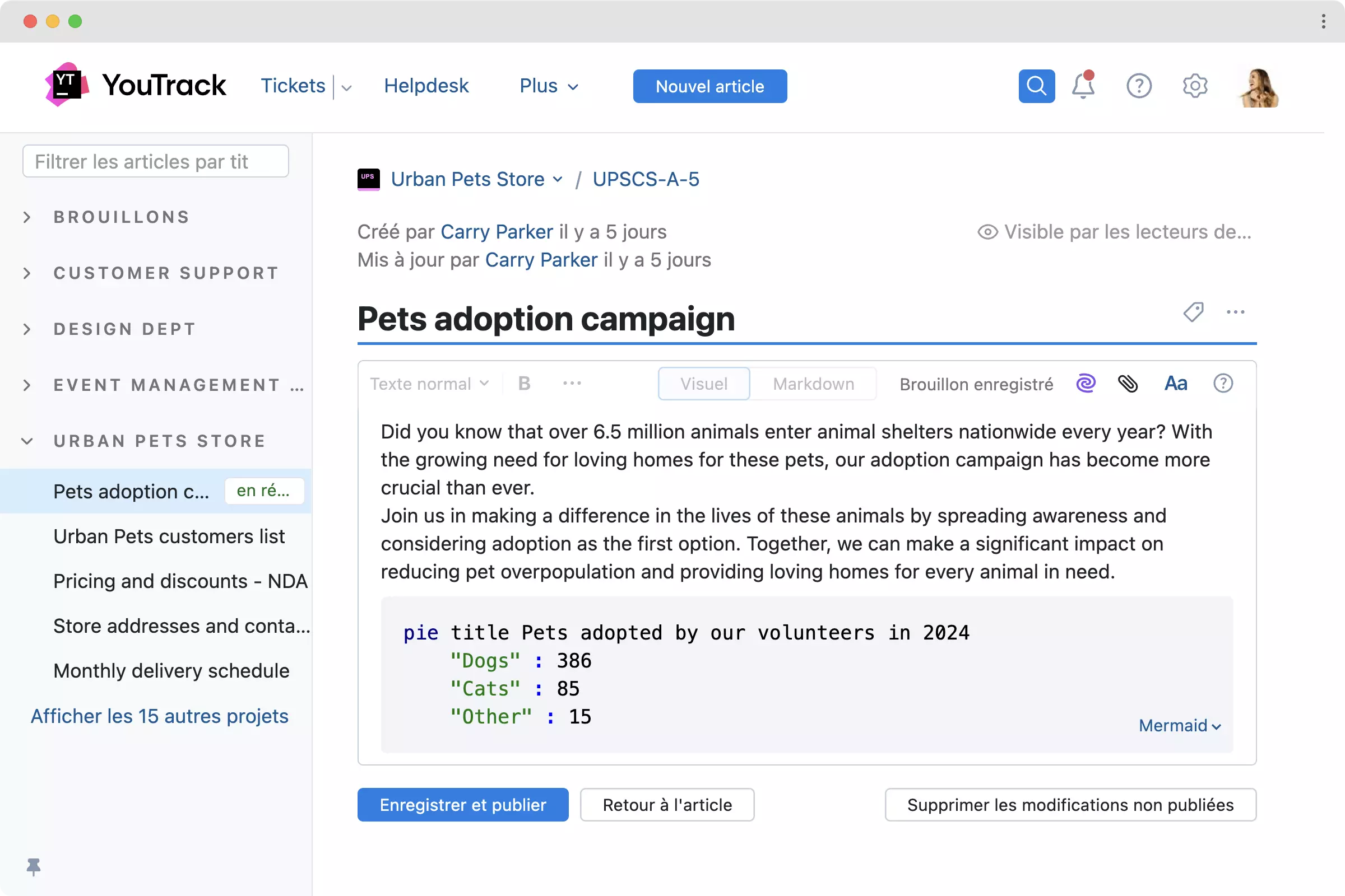 YouTrack prend maintenant en charge les diagrammes et les graphiques créés avec du balisage Mermaid. Vous pouvez les ajouter à vos tâches ou articles et les partager dans des commentaires, y compris dans les commentaires inline d'une base de connaissances. Il suffit d'insérer le bloc de code et le diagramme sera automatiquement restitué.
