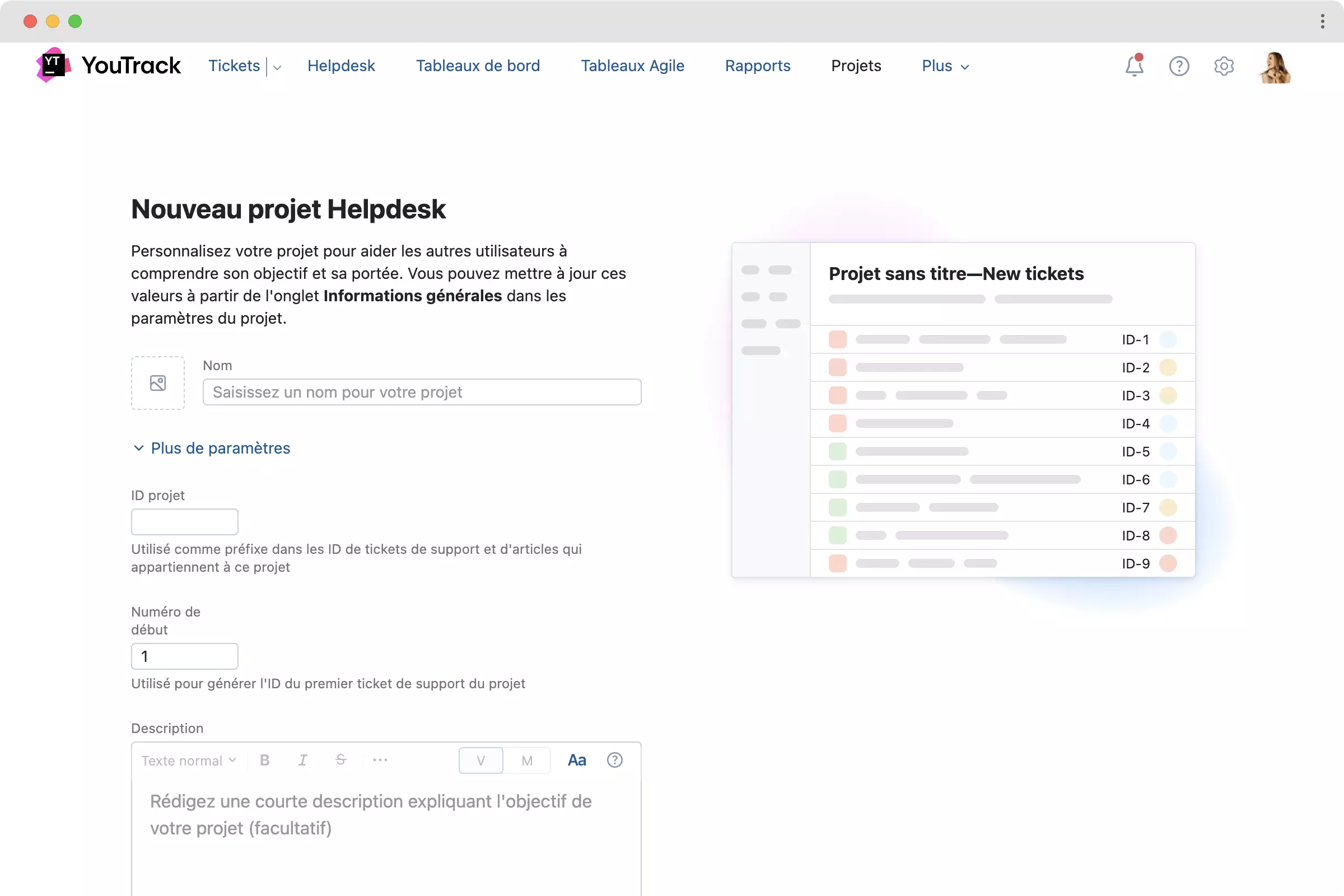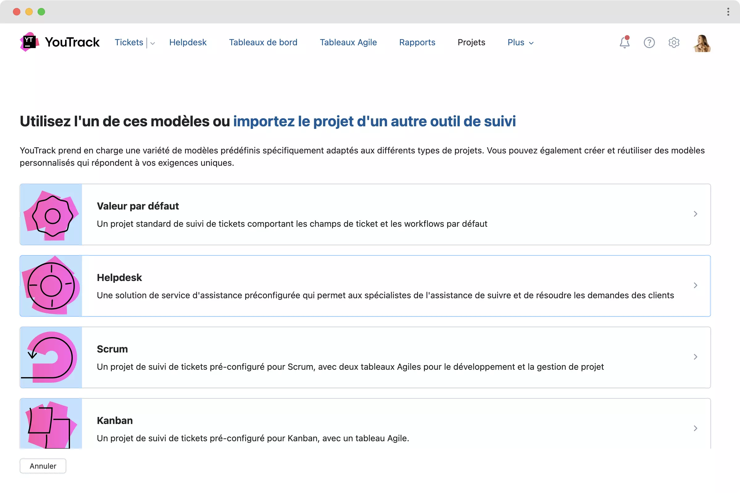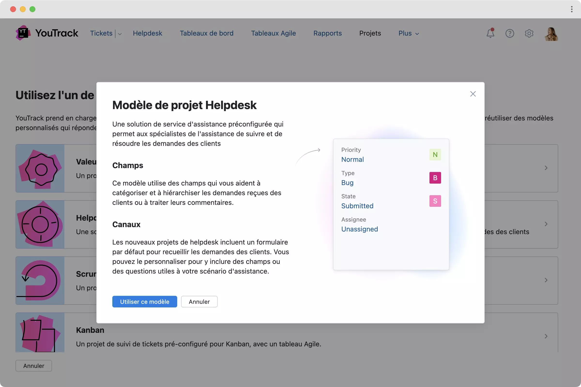 Nous avons mis à jour l'assistant de projet dans YouTrack pour aider les chefs de projets à naviguer dans le processus de création plus facilement. Vous pouvez notamment choisir entre plusieurs modèles, parcourir toutes les étapes pour personnaliser vos projets et tâches en fonction des besoins de votre équipe et inviter les membres de votre équipe.