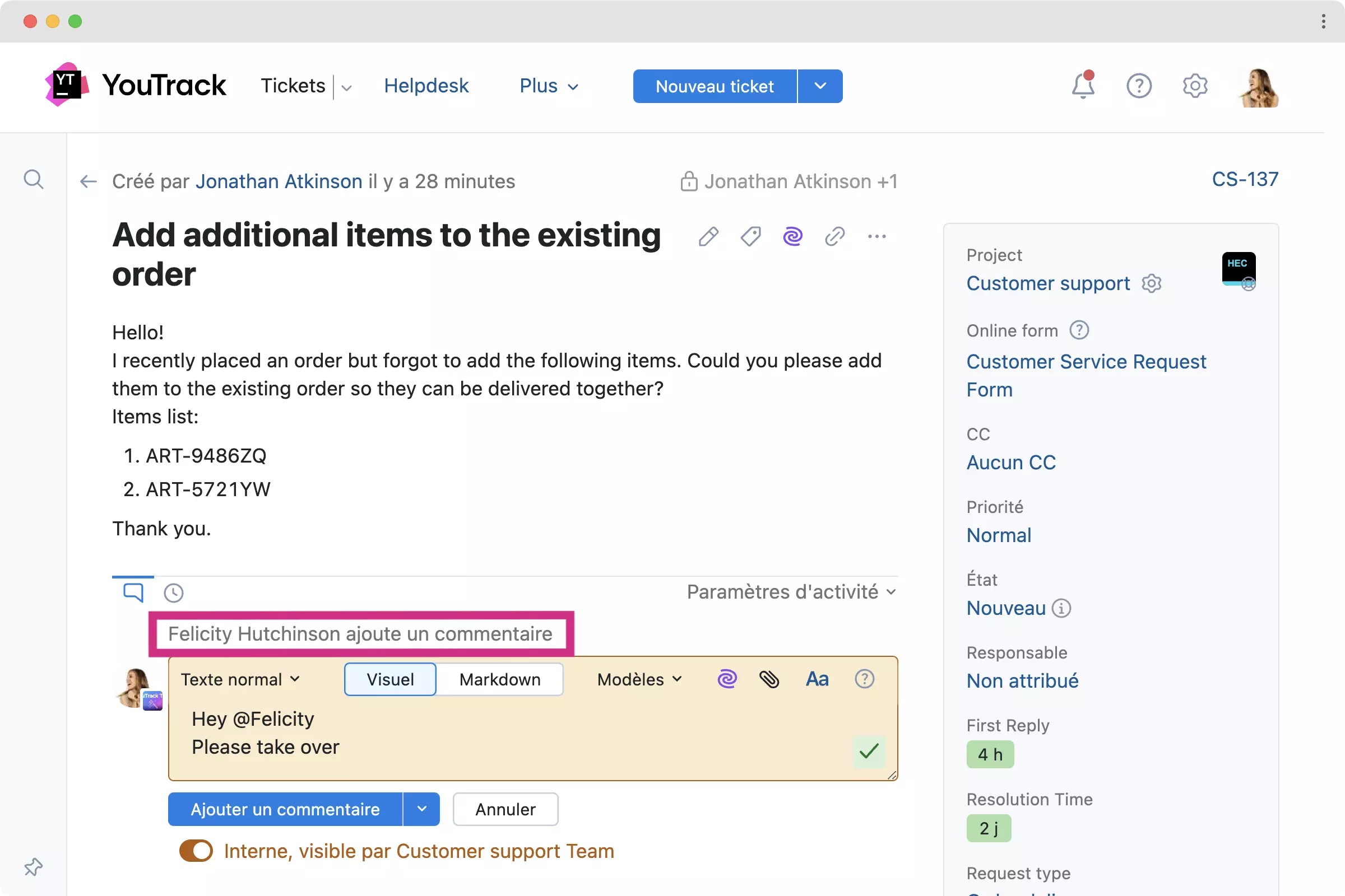 Les agents d'assistance et les membres de votre équipe peuvent désormais voir quand d'autres collaborateurs sont en train d'ajouter un commentaire à un ticket, ce qui permet d'éviter les doublons.