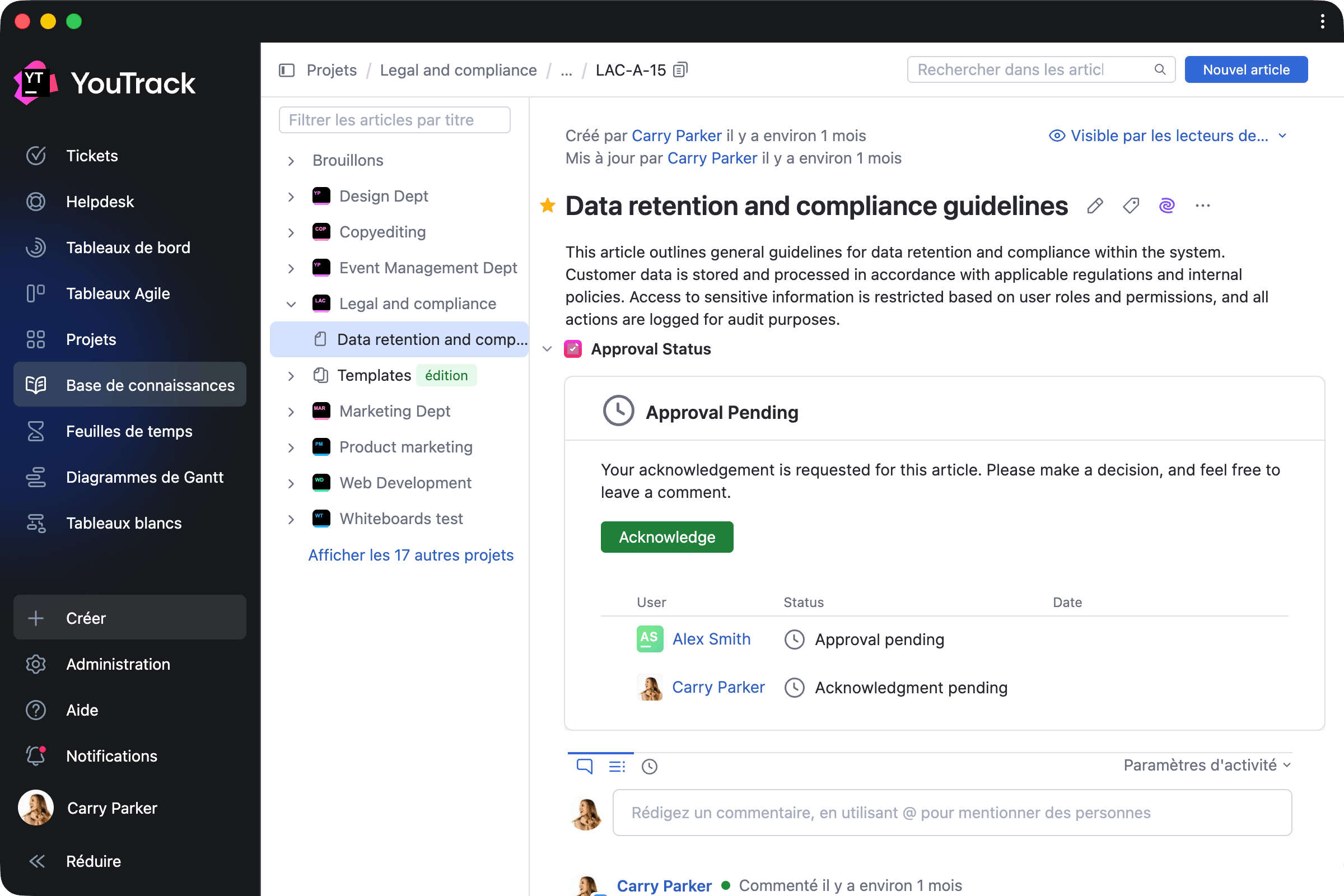 Cette application payante permet aux équipes de gérer les workflows d'approbation directement dans la base de connaissances. Vous pouvez inviter des approbateurs et des personnes devant accuser réception pour chaque article, fixer des dates d'échéance et suivre l'état des approbations.
