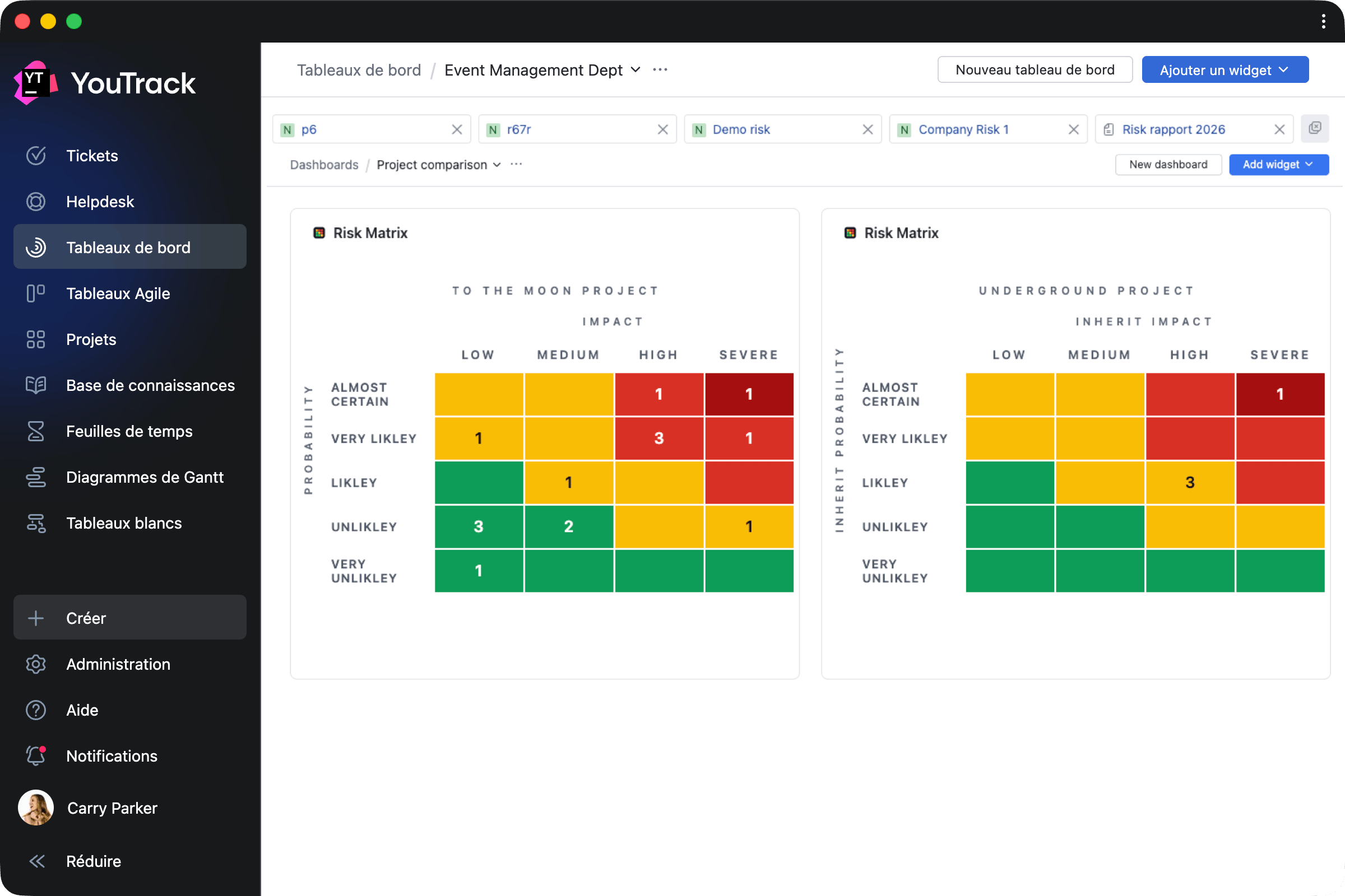 Cette application permet aux chefs de projet d'évaluer les niveaux de risque d'un projet en générant des widgets de matrice de risque dynamiques basés sur la probabilité et l'impact des résultats des tâches.
