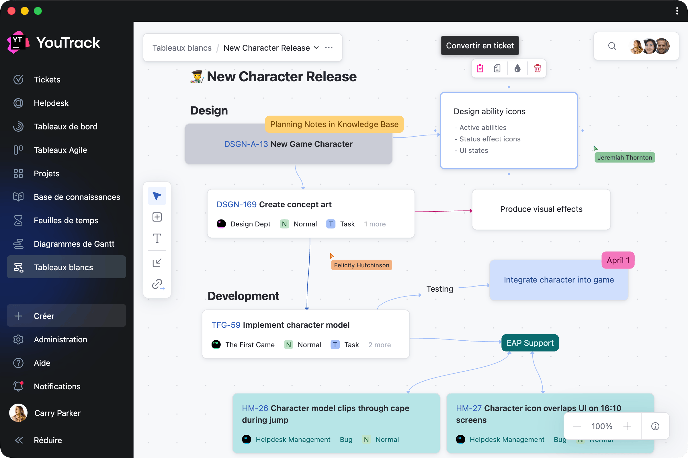 Les tableaux blancs offrent un nouvel espace flexible permettant aux équipes de planifier, de réfléchir ensemble et de collaborer efficacement. Connectez vos projets en cours pour obtenir une meilleure vue d'ensemble et organiser votre travail, ou ajoutez des notes et transformez-les en tâches et en articles dès que vous êtes prêt. Cela permet aux chefs de projet et aux équipes de planifier à partir de zéro, de collaborer sur des projets en cours et de s'assurer que chaque activité est reliée à votre travail dans YouTrack.