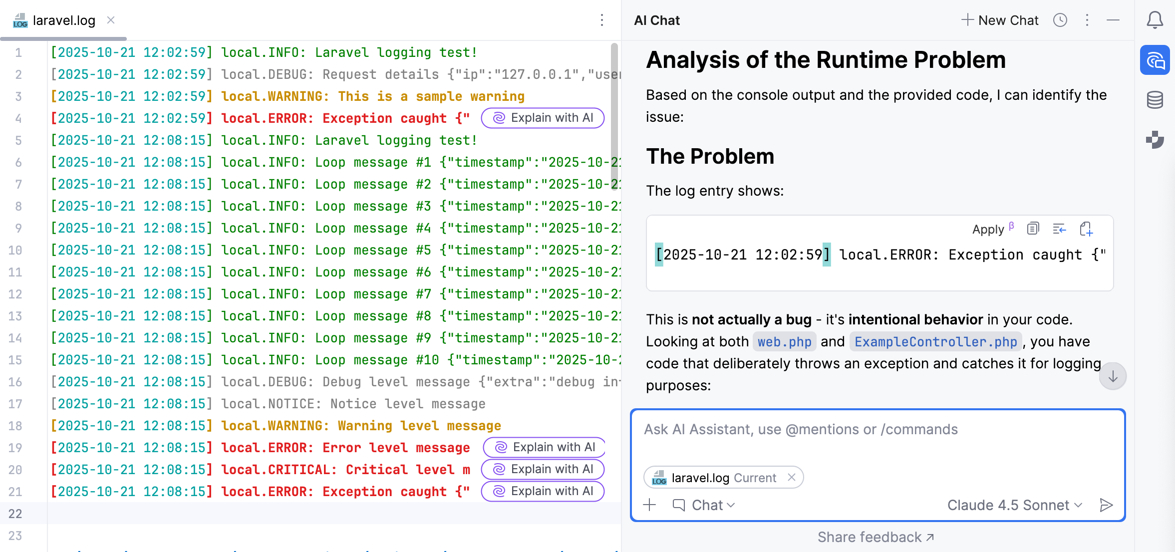 AI Assistant allows you to get AI explanations for the errors in log files when you open such files in the editor.