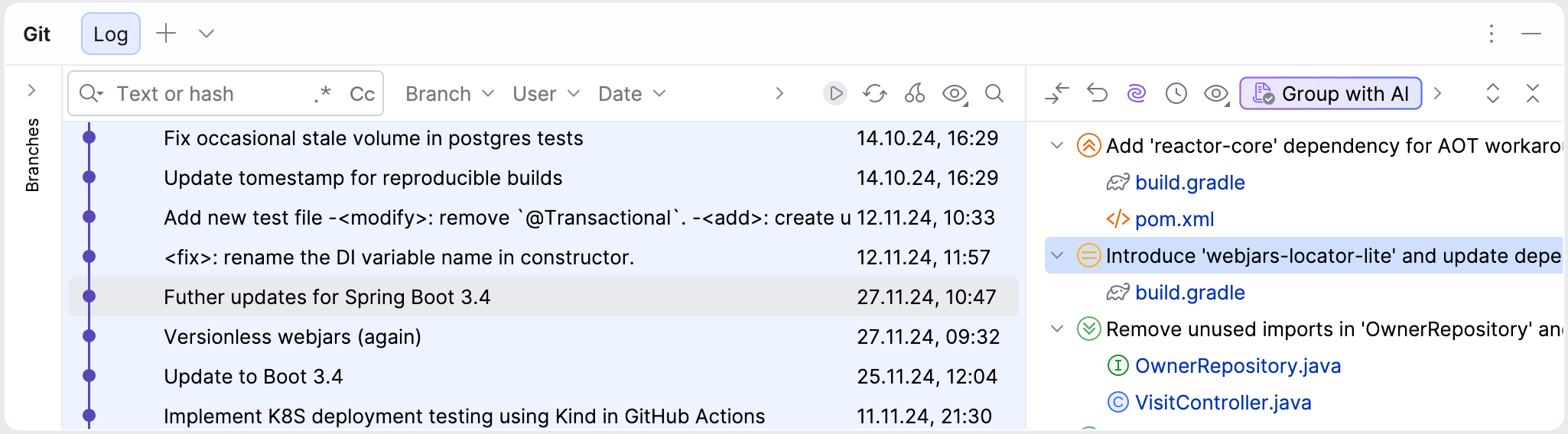 The Group with AI feature is intended to speed up the review and validation process. It evaluates both committed and uncommitted changes, clusters them into task-level groups, prioritizes them by importance, and provides brief explanations of each update, allowing you to focus on the highest-impact changes first.