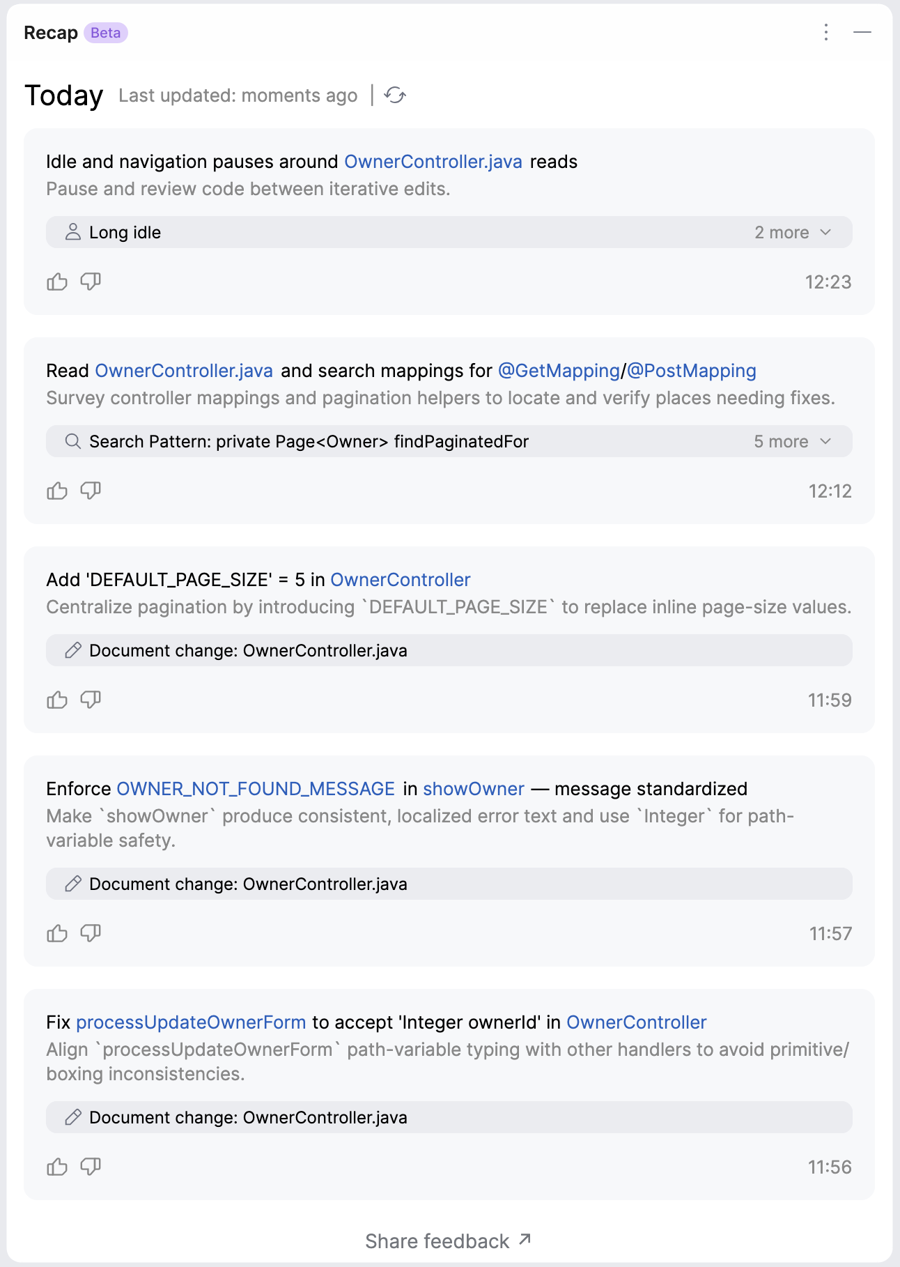 The Recap feature automatically generates a summary of your recent work to speed up context restoration. It highlights what was done and provides contextual hints, helping you to retrace your steps and continue working from where you left off.