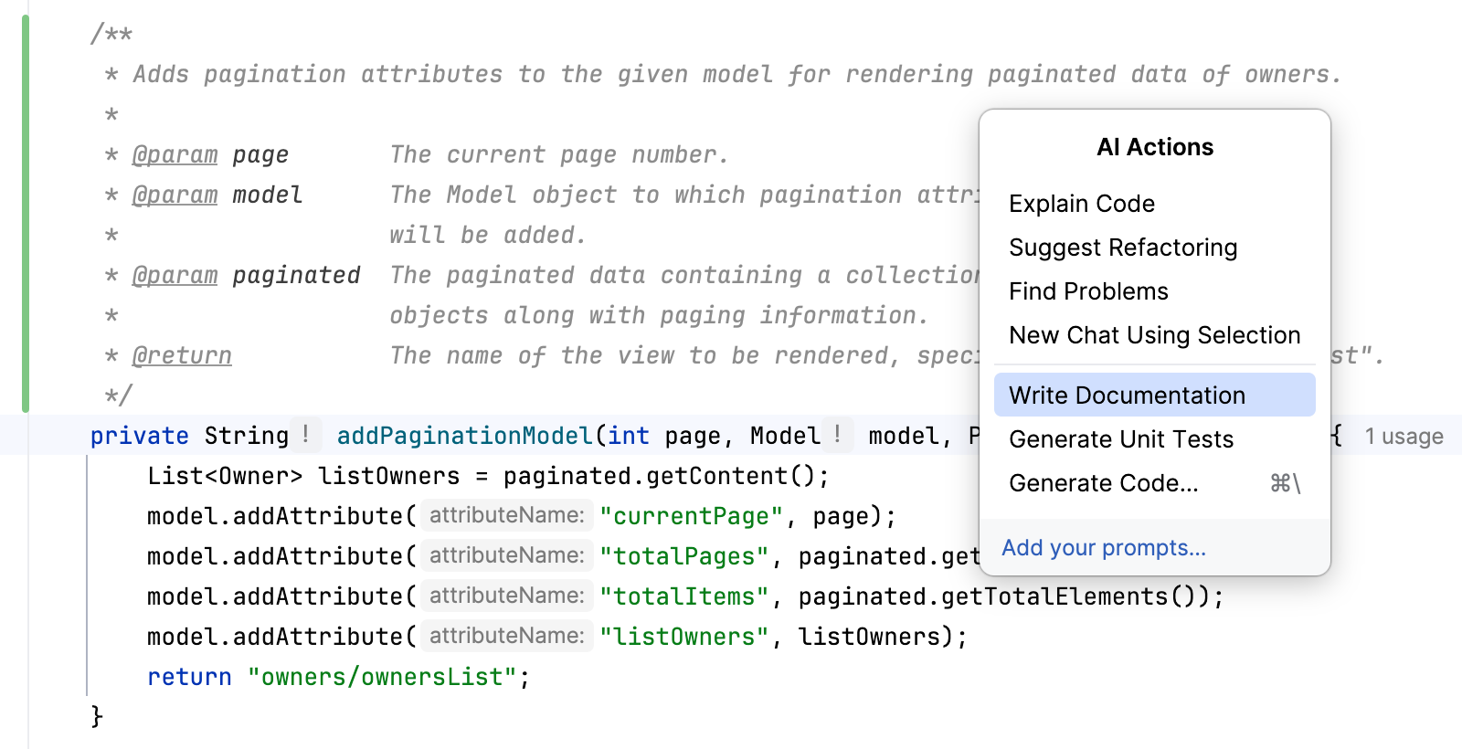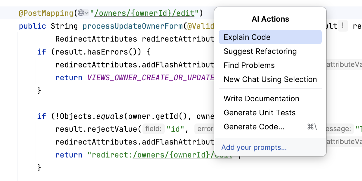 AI Assistant integrates AI-powered capabilities directly into JetBrains IDEs. It uses the context of your project – such as the currently open file, selected code, or recent changes – to generate relevant suggestions and responses.