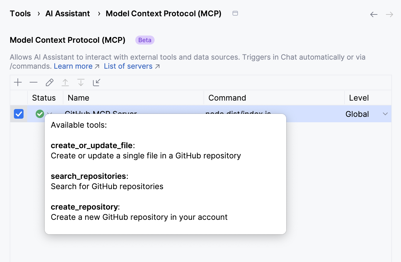 AI Assistant can interact with external tools and data sources via the Model Context Protocol (MCP). By connecting to MCP servers, AI Assistant gains access to a range of tools that significantly extend its capabilities.