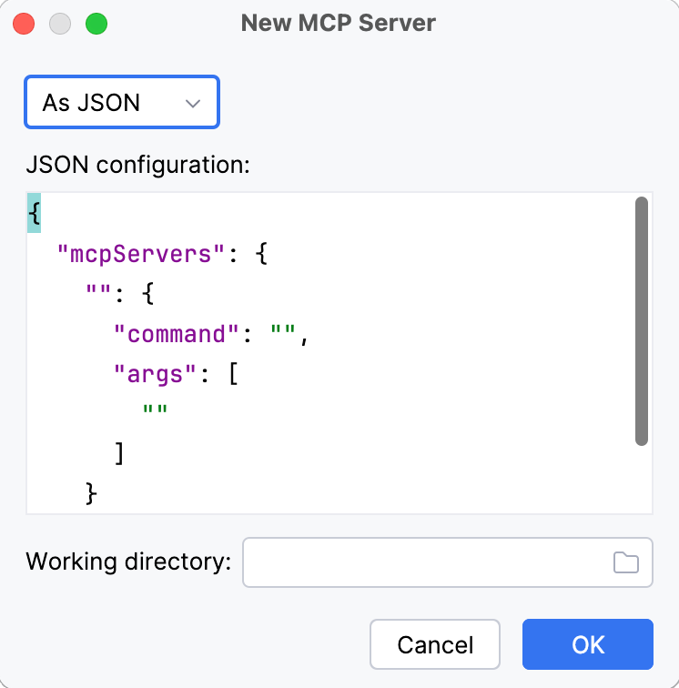To connect AI Assistant to an MCP server, you need a JSON configuration that defines the command and arguments for starting the server. The exact configuration depends on the specific MCP server. In most cases, the server's developers will provide a recommended configuration you can get and use.