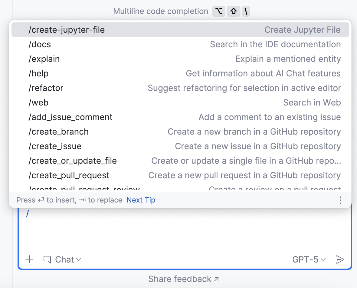 As a result, the tools provided by the MCP server become available to AI Assistant. It can trigger them automatically when processing your request, or you can invoke them manually by typing the appropriate / command in the chat: