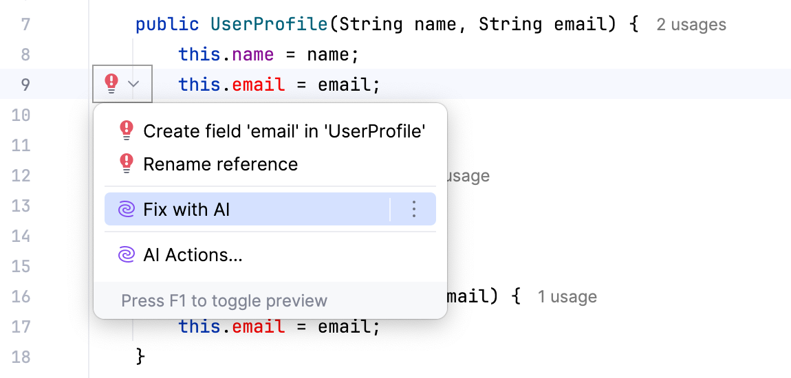 In the editor, invoke the intention actions by placing the caret at the highlighted code and pressing Alt+Enter, then select AI Actions.