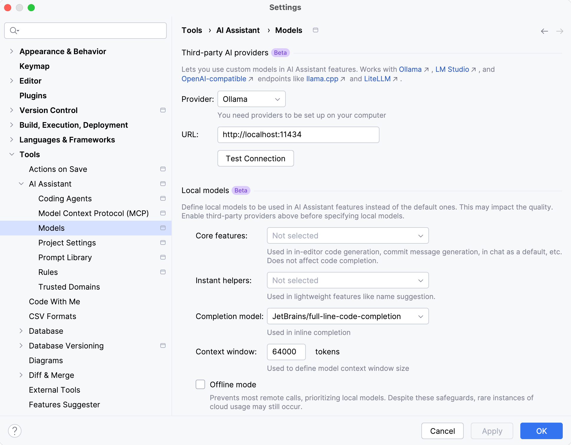 Use this page to set up custom models for AI Assistant features and to enable offline mode.
