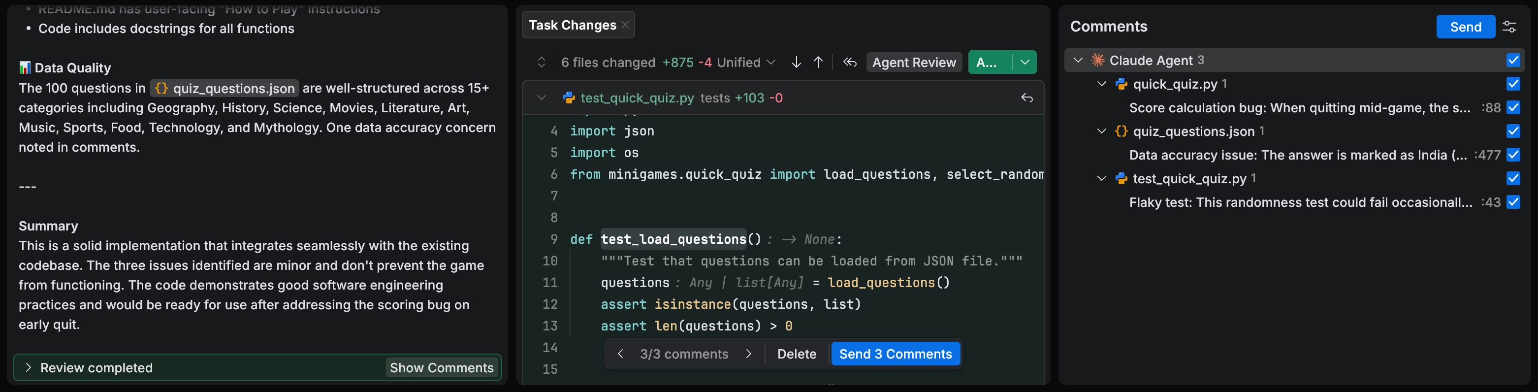 The main agent uses the accepted comments as follow-up instructions and updates the code. When it finishes, you return to the diff and review again.