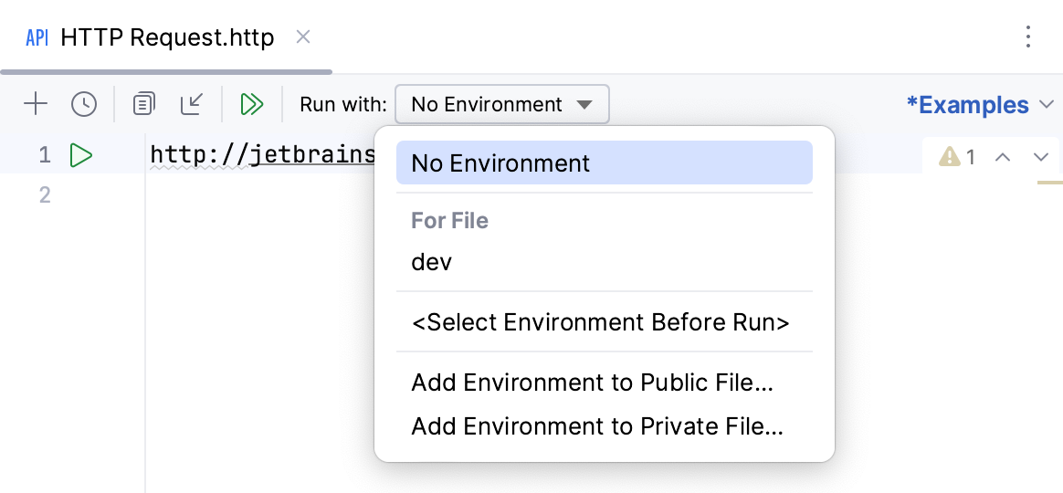 Environment variables let you store a set of environment definitions inside your project. For example, instead of providing a hostname in your request explicitly, you can create the {{host}} variable in different environments: a local hostname in the development environment and a public hostname in the production environment. You can then use the Run with list on the top of the current .http file editor to select an environment: