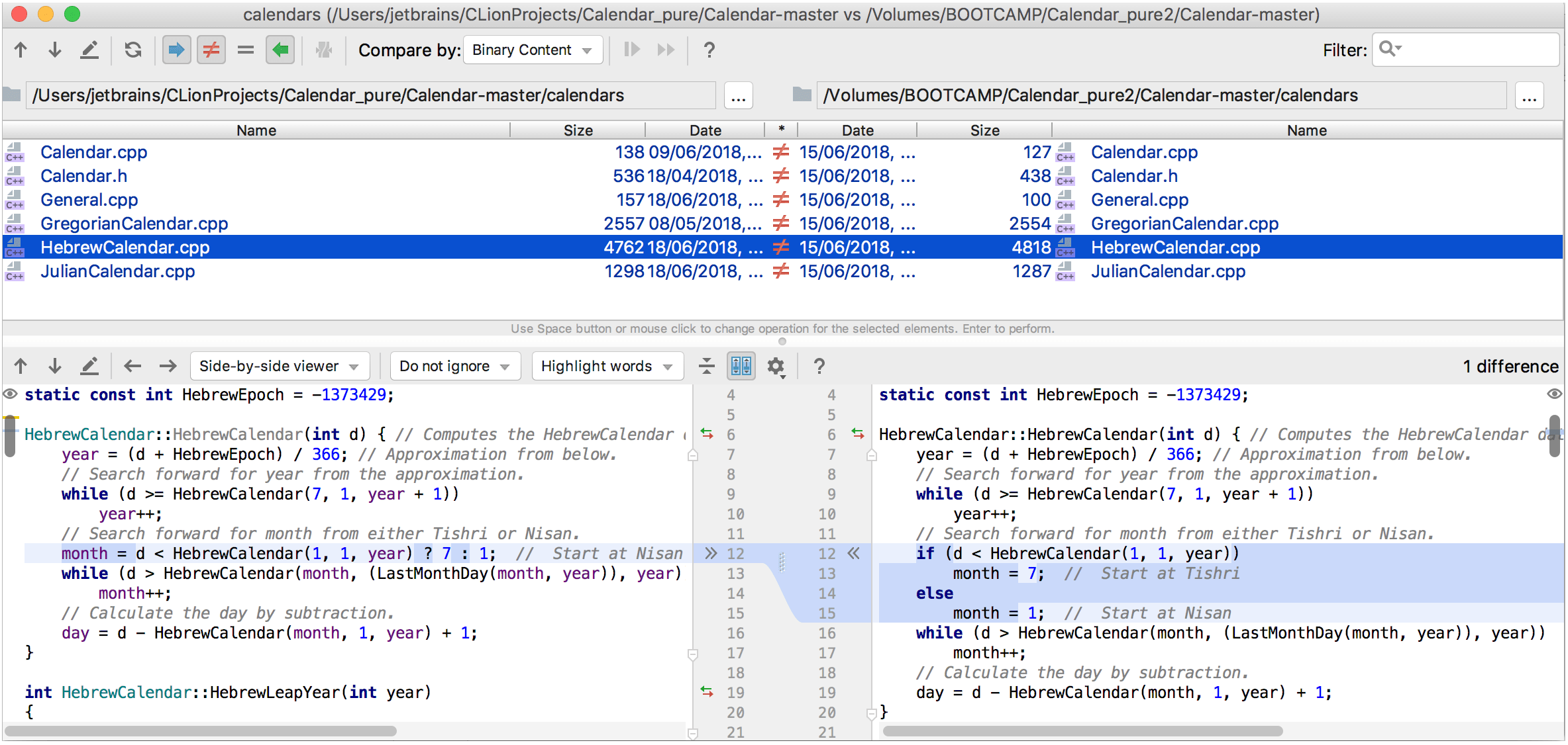 CLion provides a dedicated Diff Viewer for Folders for comparing files in remote folders and their local versions against the file size, content, or timestamp. Besides exploring differences, the tool also provides interface for synchronizing the contents of folders.