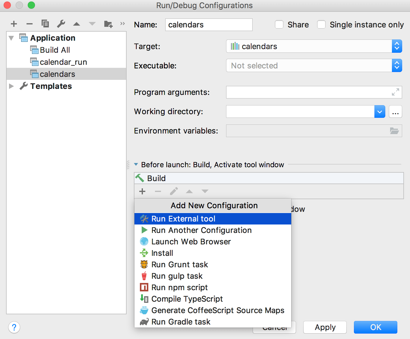 For example, your workflow may require running a specific script, code generator, analyzer, preprocessor or postprocessor, some database utility, and so on. By configuring it as an external tool, CLion provides a dedicated action for it, which you can run from the main menu, from certain context menus, assign a shortcut to it, or run it when launching a specific run configuration.