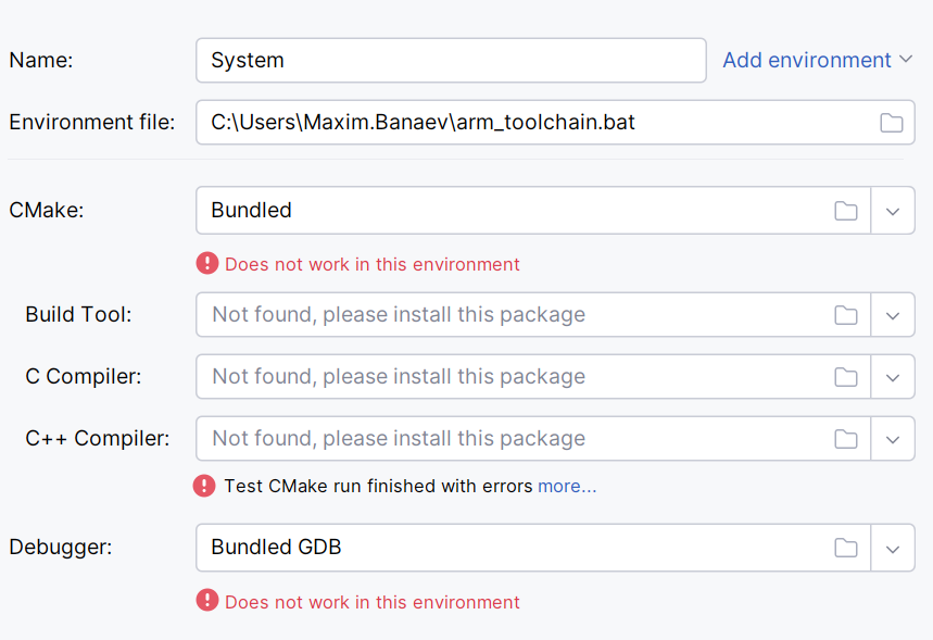 To initialize the toolchain environment via a script, click Add environment and specify the path to the file. See below for more information.