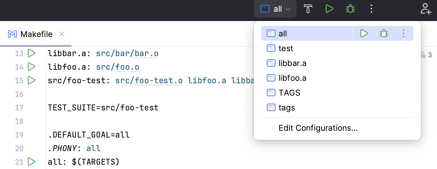 Alternatively, you can run targets from the Make tool window (). Double-click a target or select it and then click :