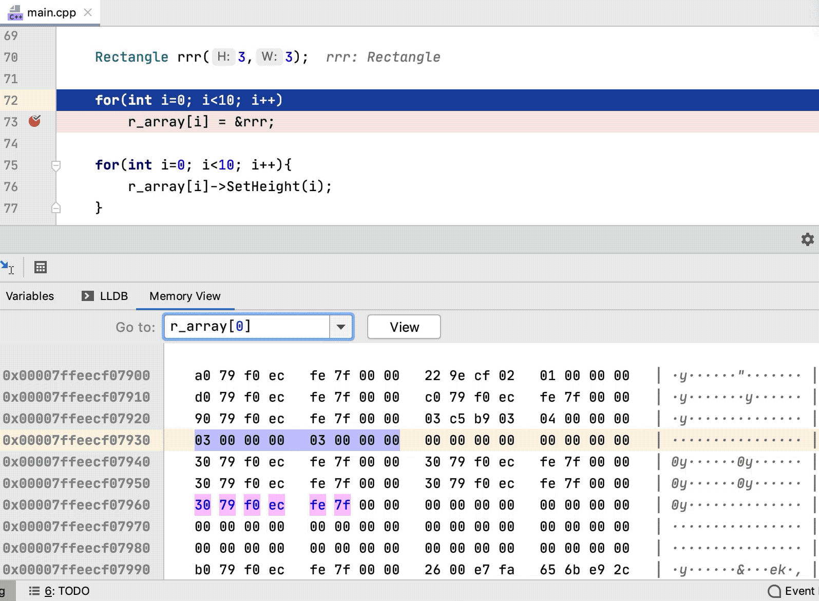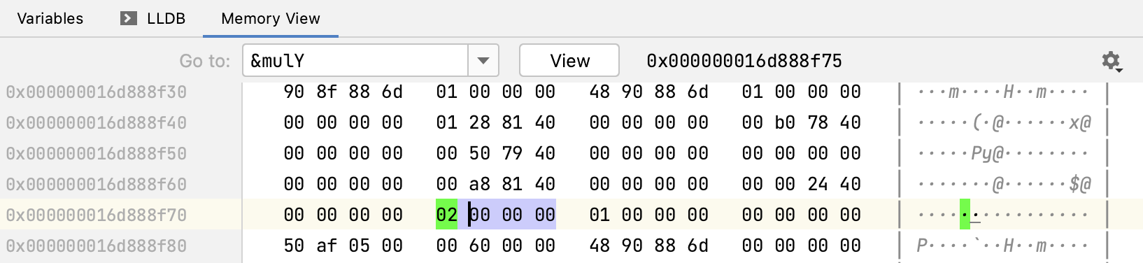 When you step through the code, CLion highlights the changes that happen in the currently shown memory region: