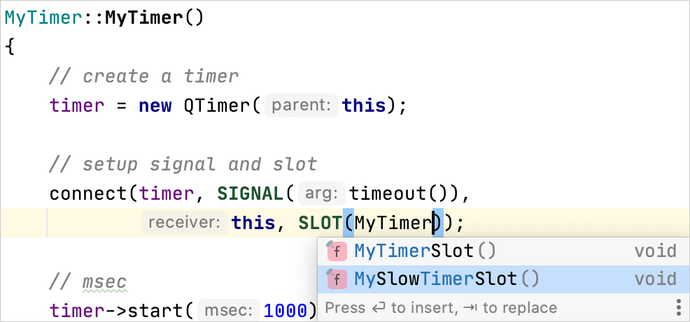 CLion provides code completion for Qt signals and slots, filtering the suggestion list to show only the corresponding members: