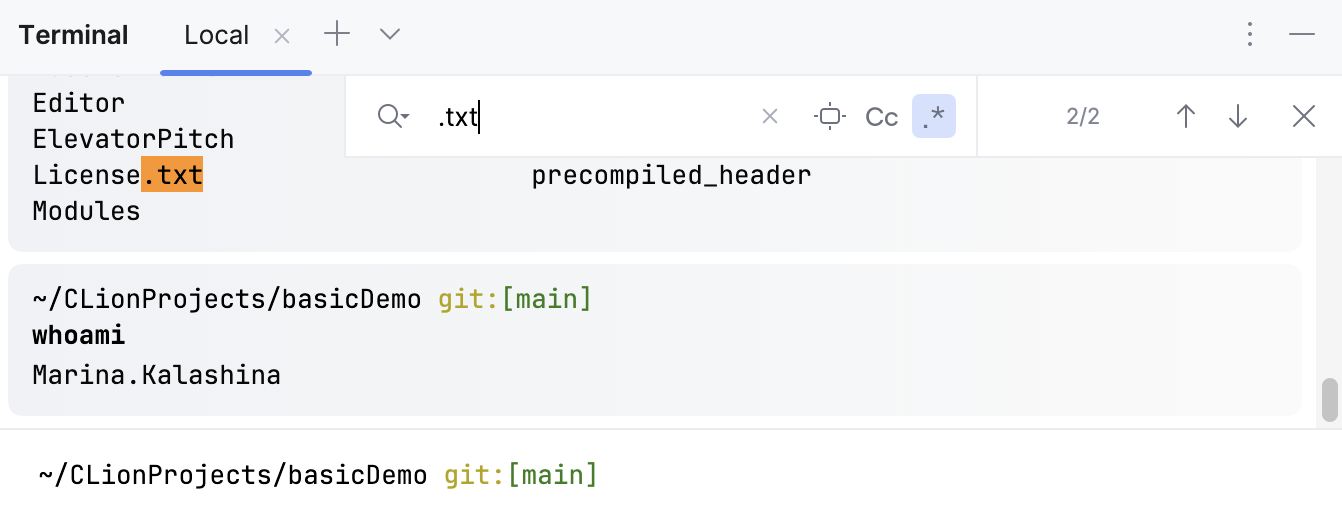 CLion provides completion for command names, options, and arguments, such as paths, Git branches, flags, and more.