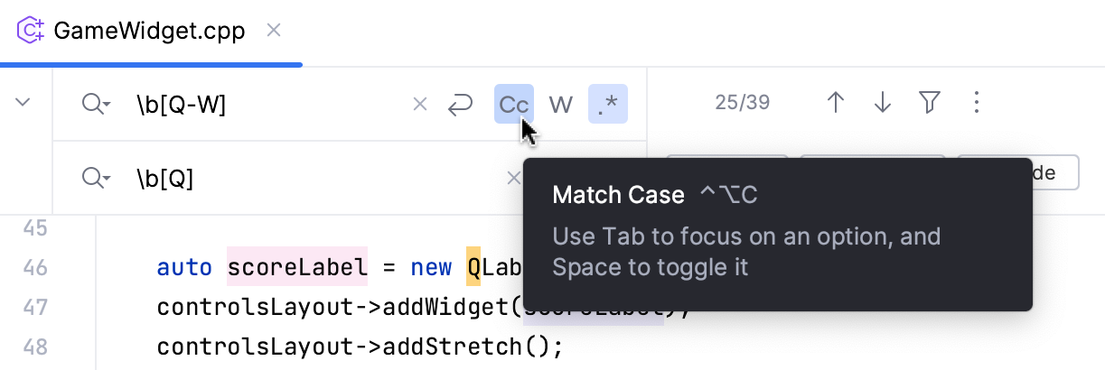 CLion highlights the found occurrences based on your search specifications and displays hints with the replace string.
