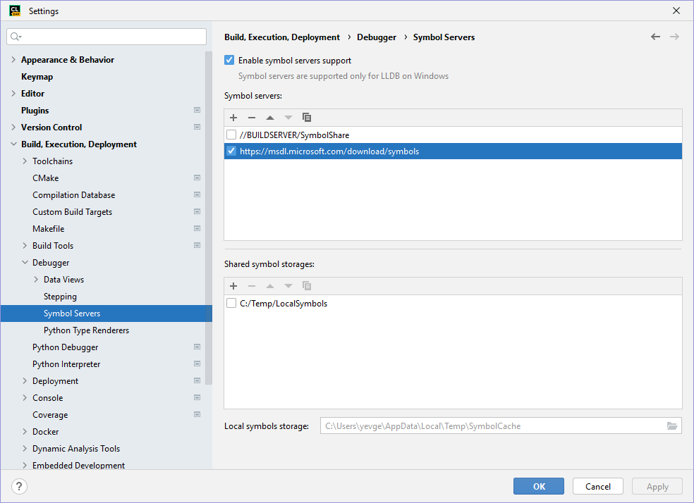 CLion lets you configure symbol servers (or indexed storages) and non-indexed shared folders separately. If you need to add a public Microsoft symbol server, click the corresponding link.