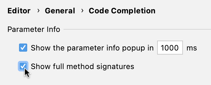 The Parameter Info popup shows the parameter names in function calls. CLion automatically shows a popup with all the available signatures within 1 second (1000 milliseconds) after you type an opening bracket in the editor or select a method from the suggestion list.
