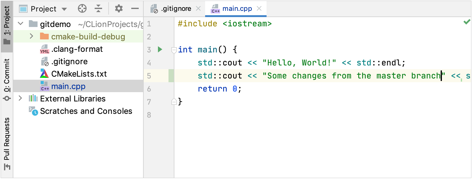 README.mdfile and replace the existing text with the new description:#Demo This is a demo project where you will learn how to commit and push changes, create and merge branches. Refer to `git-features.md` to check the list of Git operations.In the Project tool window Alt+1 and in the editor tabs, CLion applies different colors to files: blue to modified, green — to newly added. Moreover, in the gutter area of a modified file, the colored change markers appear next to the modified lines.
