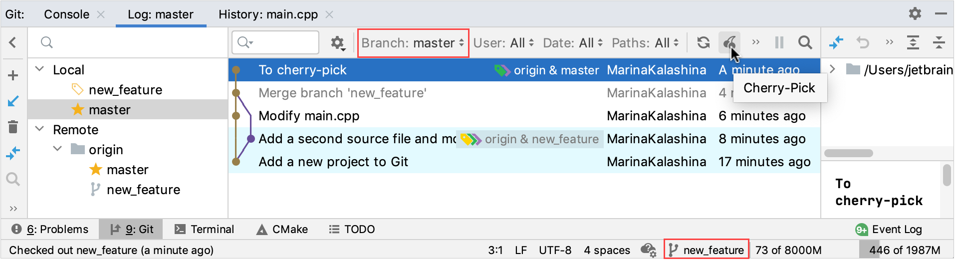 This tutorial will guide you through the most popular Git operations and show how they can be performed in CLion. You will learn how to create Git repositories from your projects, share them on GitHub, commit and push changes, create and merge branches, resolve merge conflicts, and investigate the files' history.