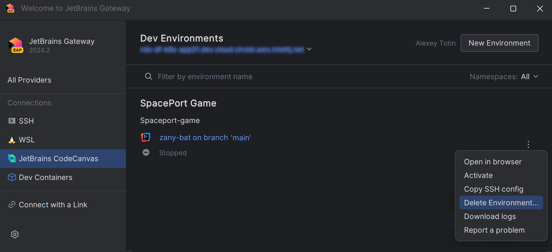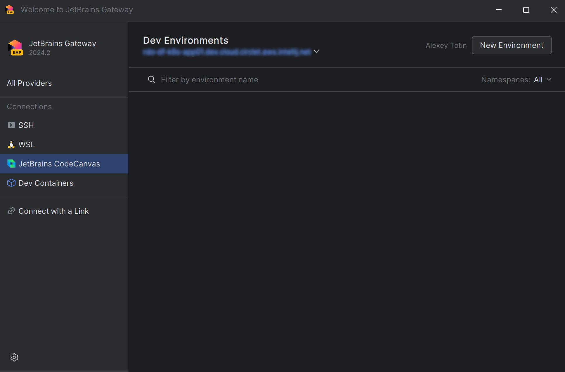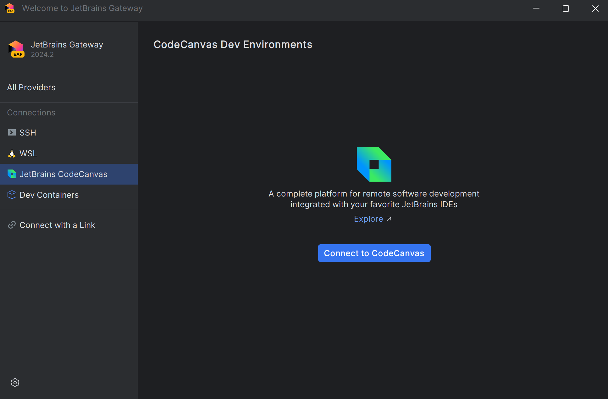 In the Gateway app, select JetBrains CodeCanvas from the list of available Connections.