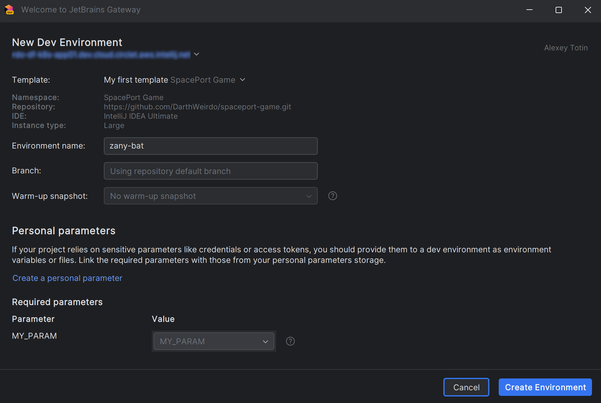 Personal parameters– if your project requires sensitive data, like access tokens or credentials, you should provide them to the dev environment as environment variables or files. You can't provide the values directly. Instead, you should create the corresponding parameters in your personal storage in CodeCanvas and then link them to the required parameters. To do this: