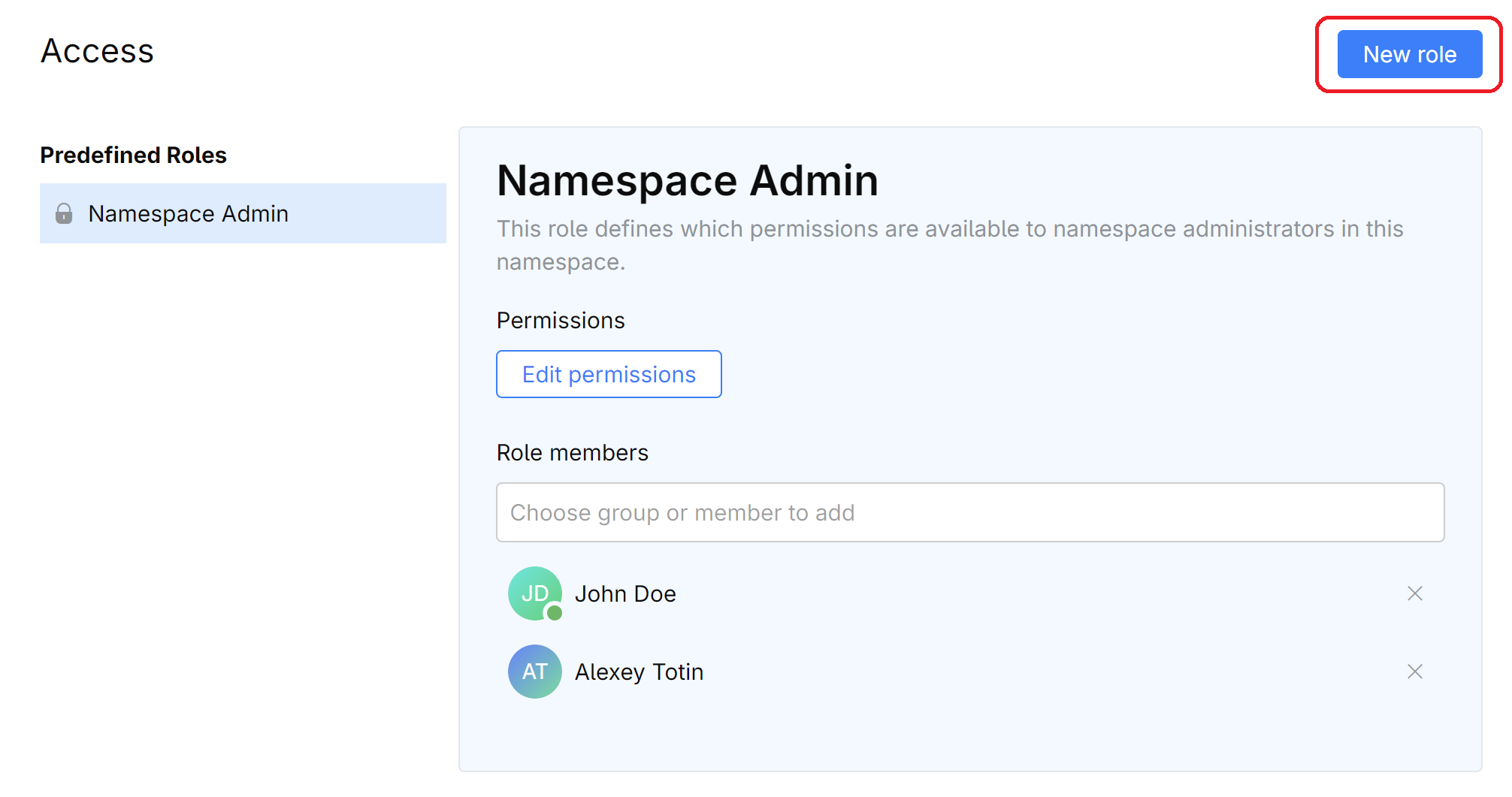 By default, only a system administrator can create a namespace. After the namespace is created, the administrator can add other users to the namespace and assign them roles. By default, a namespace comes with only one predefined role: