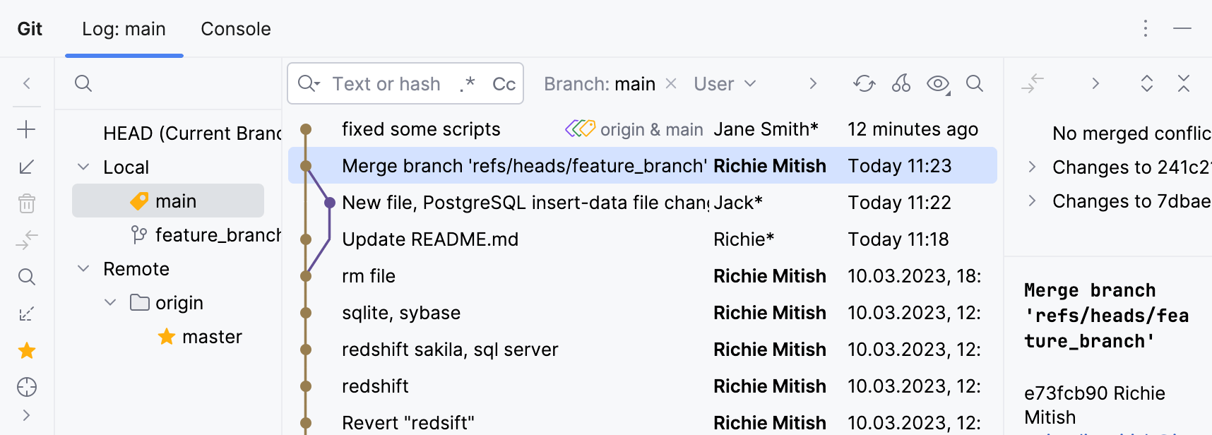 With Git integration in DataGrip, you can edit history for the sake of making it linear and meaningful by performing interactive rebase. This allows you to clean up the history of commits by altering individual commits, changing their order, squashing commits into one, skipping commits that contain extraneous changes, and so on before you integrate changes from your feature branch to another branch.