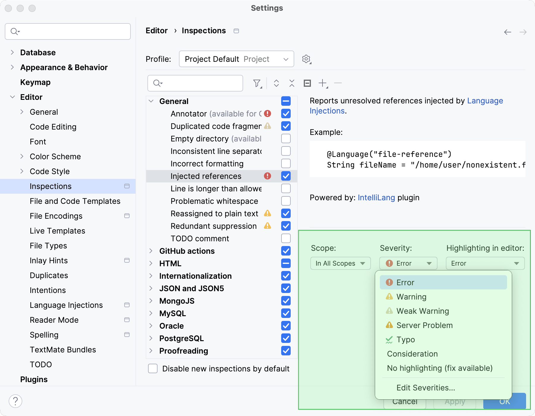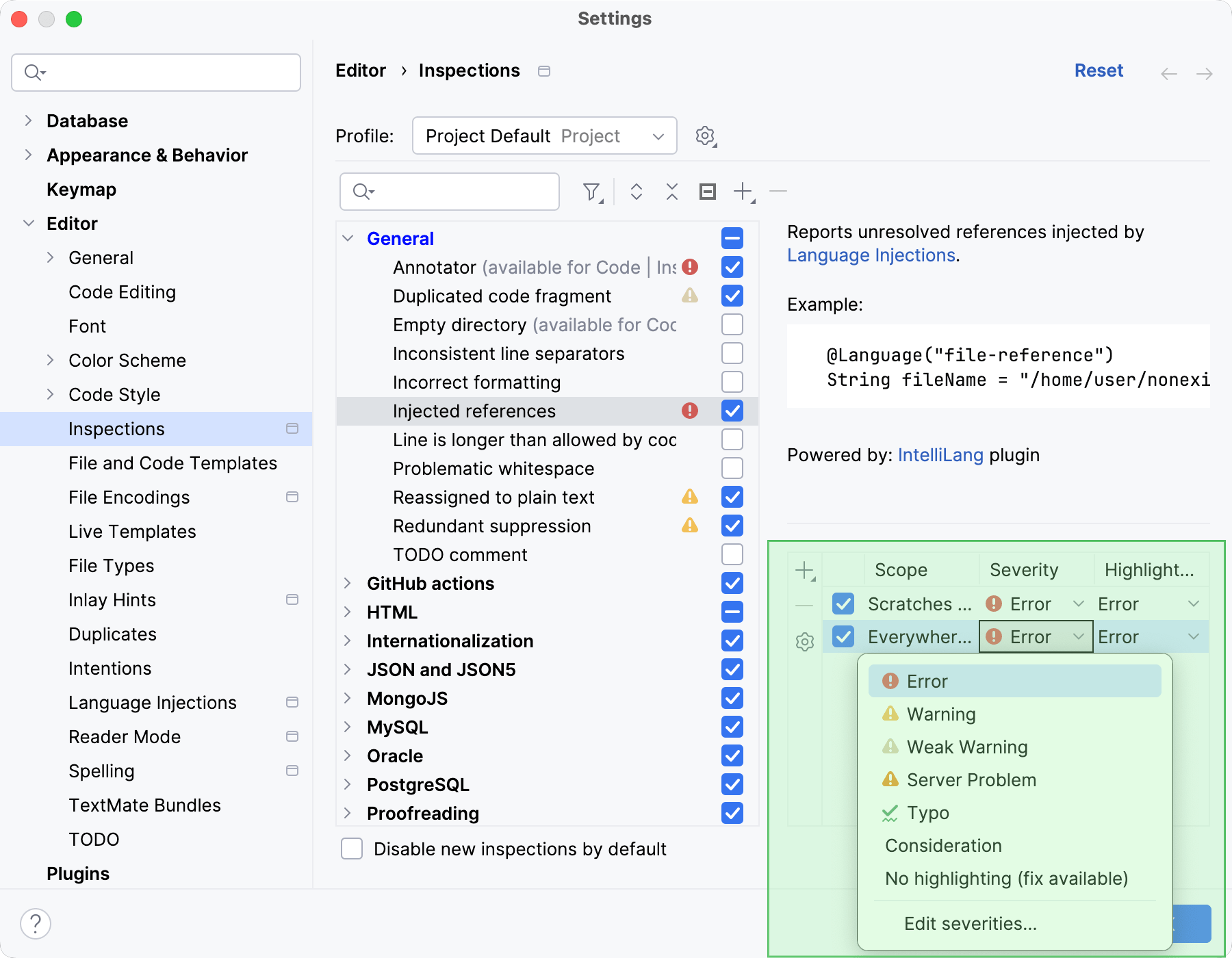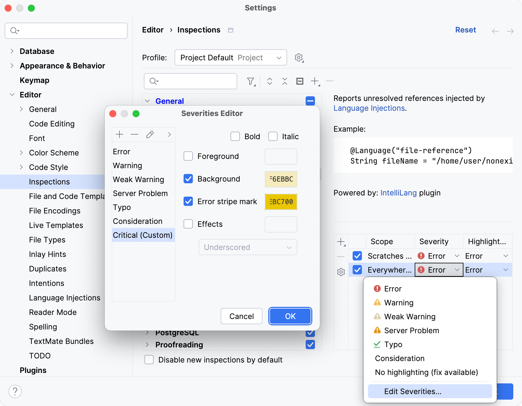 3. Click any inspection and select Edit severities from the list of severity levels.
