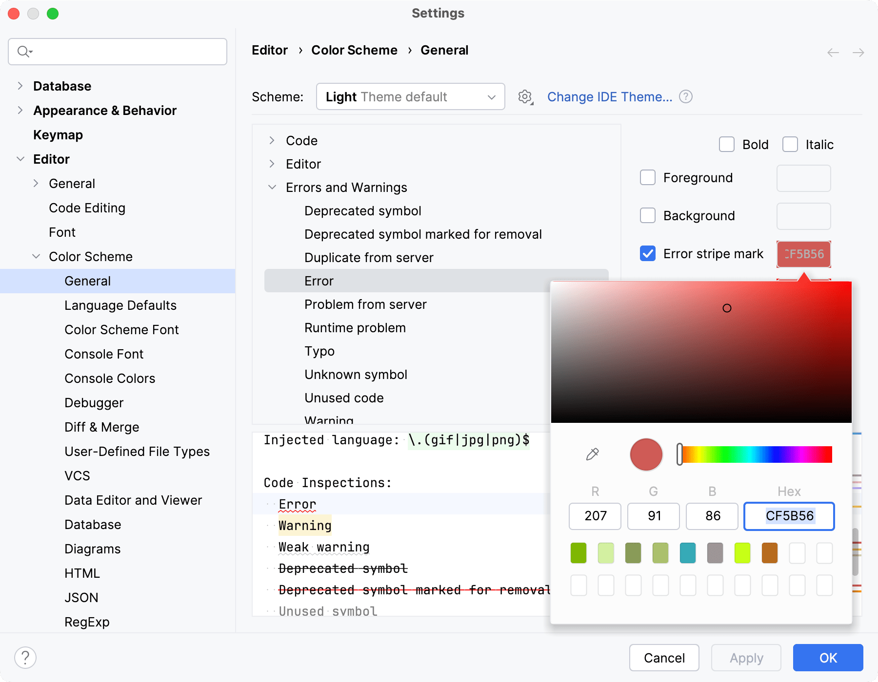 Code fragments that can be improved. This severity level is not marked on the error stripe and does not have a default highlighting style, but you can select one from the list of existing styles or configure your own.