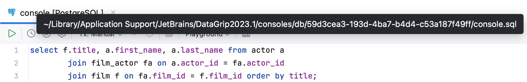 All the created query consoles are located in the internal Database Consoles directory. To open this folder, open the Files tool window Alt+2 and navigate to . On your machine, the query console files are stored in the consoles subdirectory of the IDE configuration directory.