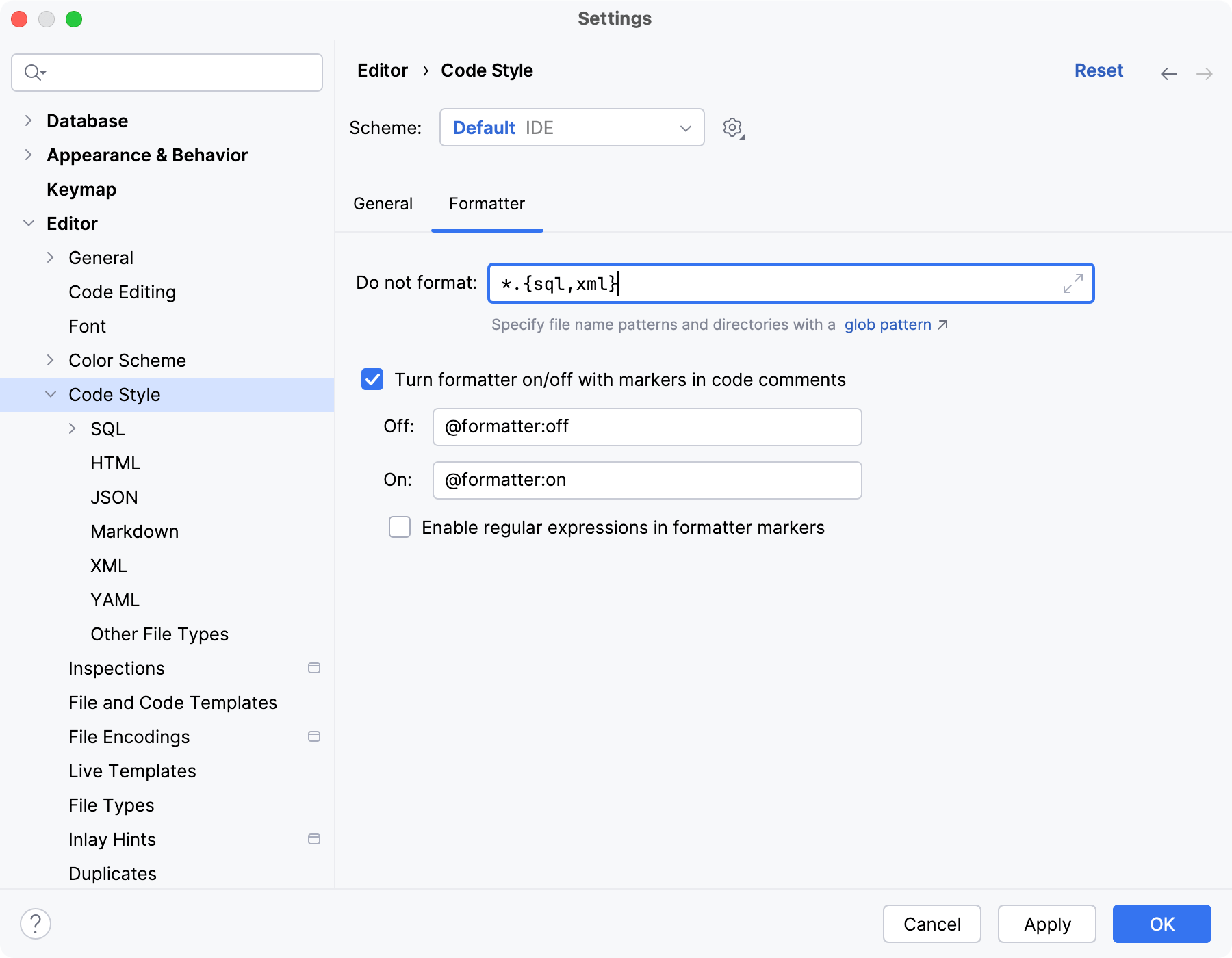 2. Switch to the Formatter tab and in the Do not format field, enter the files and directories that you want to exclude using a glob pattern.