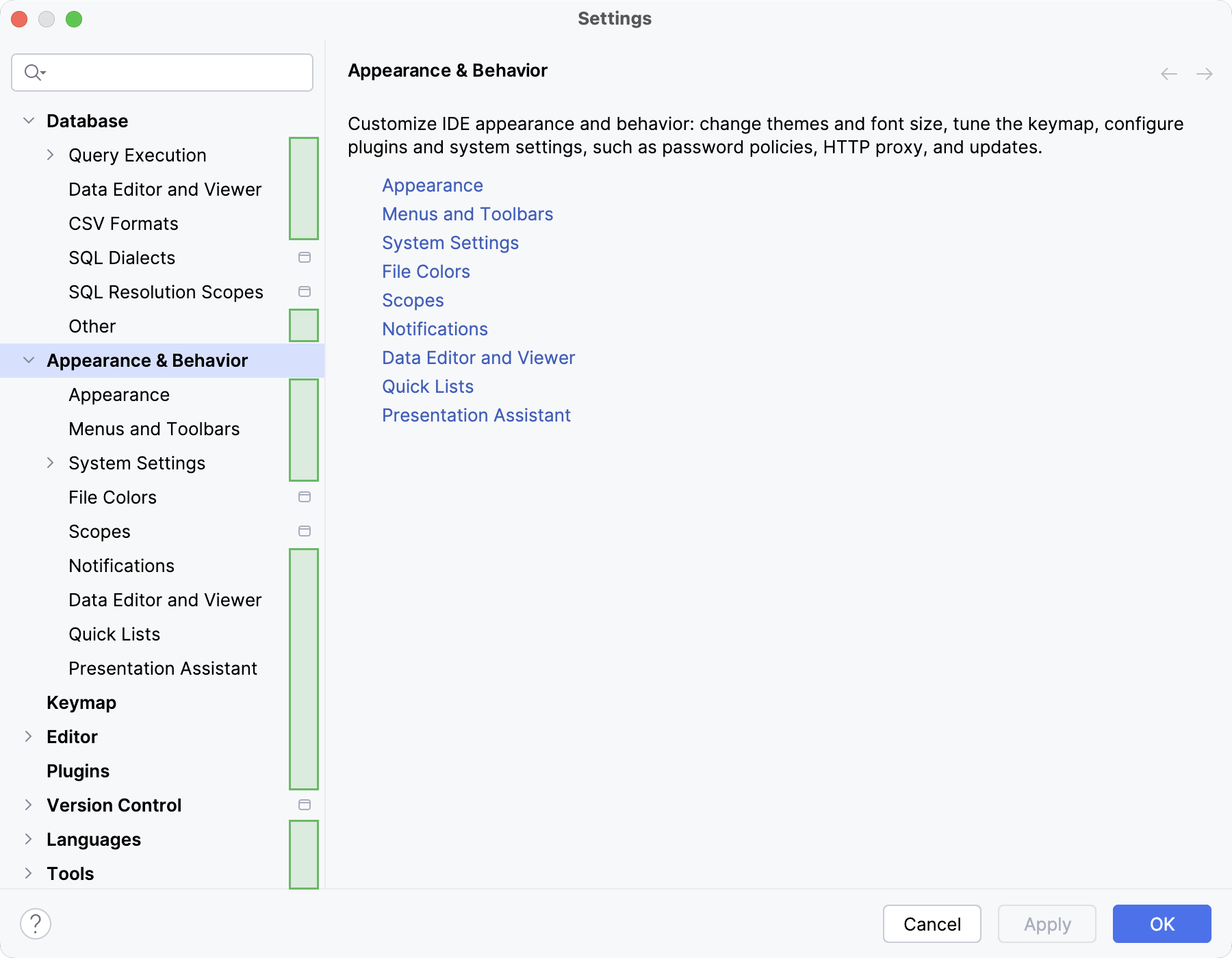 Global settings apply to all projects that you open with a specific installation or version of DataGrip. Such settings include IDE appearance (themes, color schemes, menus, and toolbars), notification settings, the set of installed and enabled plugins, debugger settings, code completion, and so on. Global settings are stored in the configuration directory.