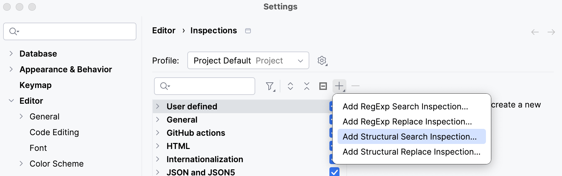 3. On the toolbar, click the Add Custom Inspection button (the Add Custom Inspection button) and select Add Structural Search Inspection… if you want your inspection only to highlight code. Alternatively, click Add Structural Replace Inspection… if you want your inspection to highlight code strings and suggest fixes.