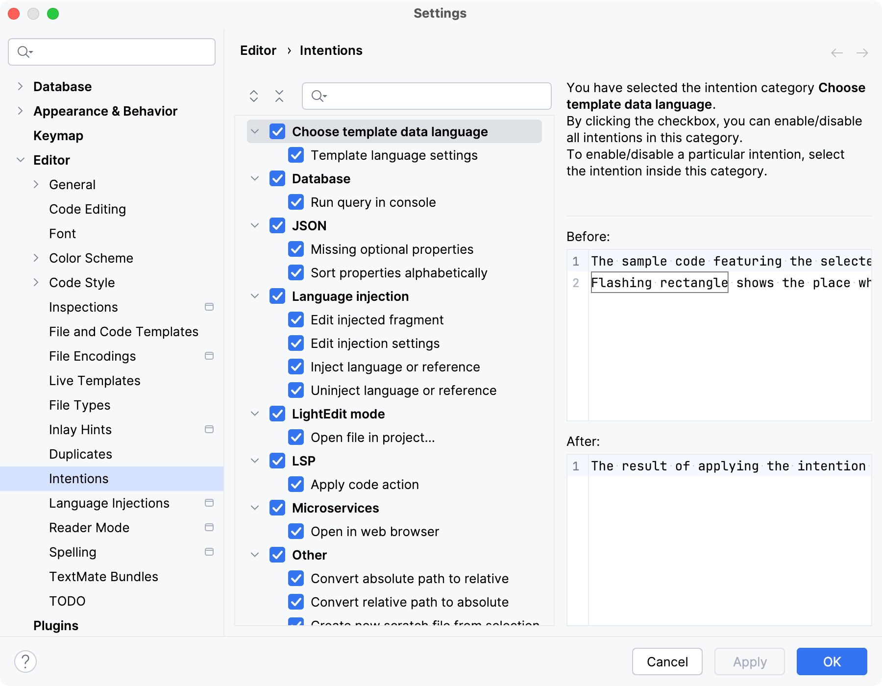 You can view the full list of available intention actions and disable actions that you do not need at the moment. To open the list of intention actions: