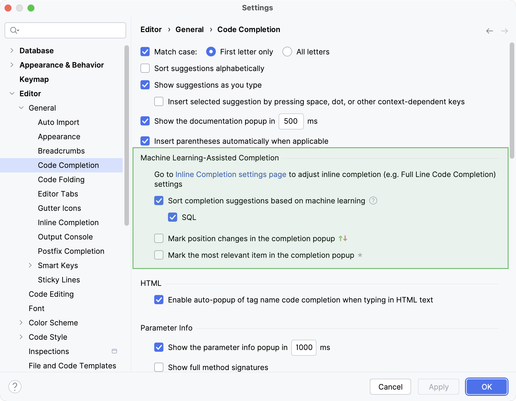 2. Under Sort Suggestions with ML, enable the Sort completion suggestions based on machine learning option and select the languages for which you want to use the ML completion.