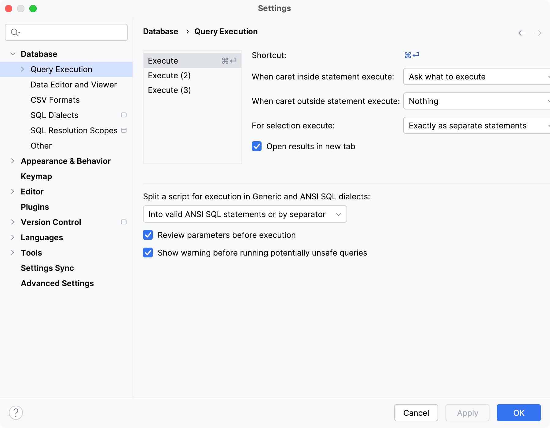 Into valid ANSI SQL statements or by separator: DataGrip analyzes a script and splits it on valid statements or by separators. This setting is default.