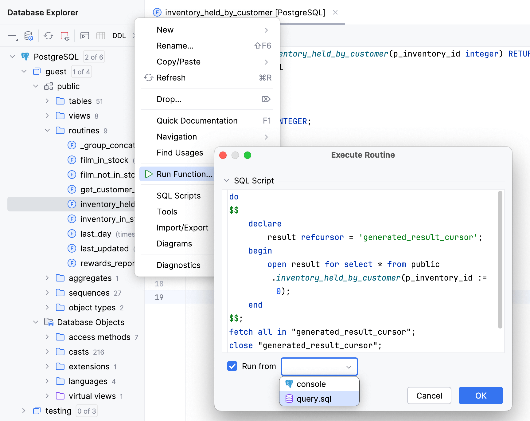 In order to run SQL scripts, treat the usages of the database objects as links, and provide you with correct code completion, DataGrip must resolve the database objects in your code to a certain context. By default, IDE uses one of the following as a starting point to resolve the database objects to: <schema> selector, or the default database (if none of the above is set).