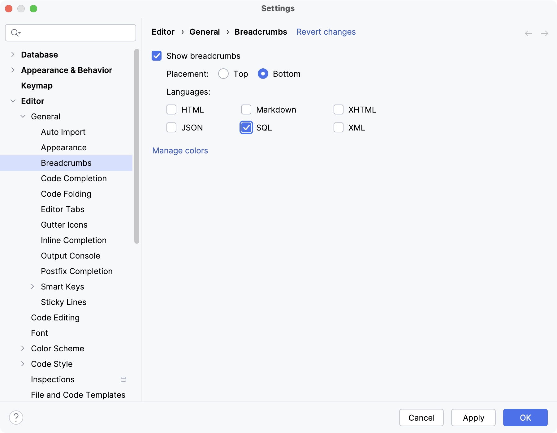 For example, for Java, SQL or Python, you can select the Jump outside closing bracket/quote with Tab option to enable navigation outside the closing brackets or quotes with Tab when you type your code.