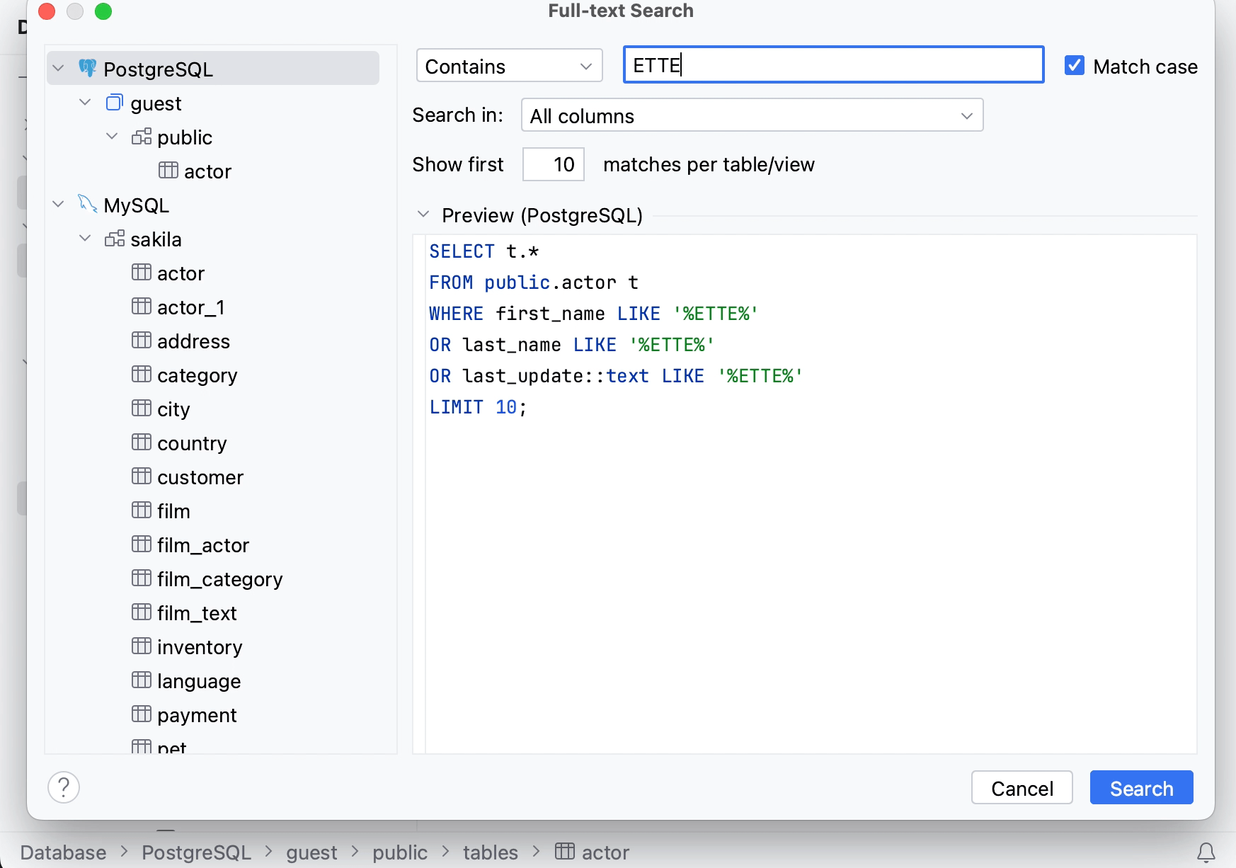 Only columns with full-text search indexes | Searches only in columns that have a created index. This feature is supported only for PostgreSQL, MySQL, and MariaDB. The query for PostgreSQL is |