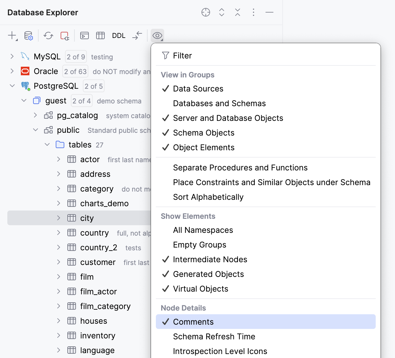 You can view the list of created data sources and explore them in the Database Explorer (View | Tool Windows | Database Explorer) .